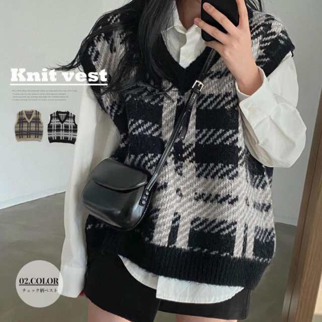 韓国風 チェック柄ベスト ショート丈 ノースリーブ ニットトップス レイヤードベスト Vネック レトロ 20代 30代