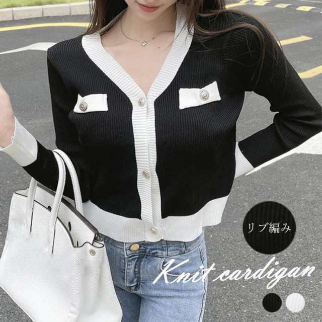 レディース Vネック 長袖ニット ショート丈 アウター リブ編み ニットセーター 韓国風 前開き トップス