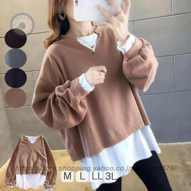 重ね着風 トレーナー レディース 長袖 トップス カットソー Tシャツ ゆったり プルオーバー レイヤード 大きいサイズ