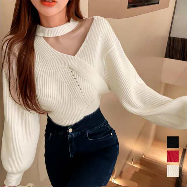 大人可愛い ニットソー長袖 セクシー リブニット オフショルダー 韓国ファッション 肩開きトップス ホルターネックニット