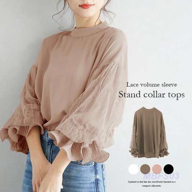 パフスリーブ レディース ブラウス ハイネック 大きいサイズ 20代 30代 ボリュームスリーブ とろみトップス 秋 春 ギャザー ボリューム袖 ぽわん袖