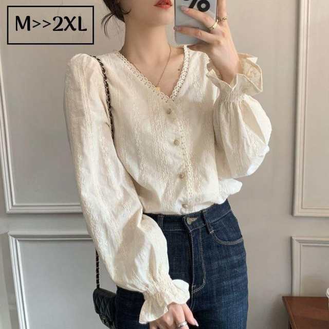 ブラウス 長袖 レディース 大きいサイズ トップス シャツ 前開き レース ゆったり Vネック バルーンスリーブ フリル 可愛い