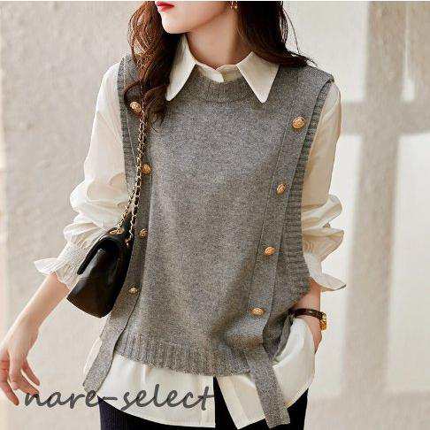 アンサンブルニット ニットベスト レディース トップス 長袖 黒 秋 冬 春 シンプル 通勤服 オフィス カジュアル