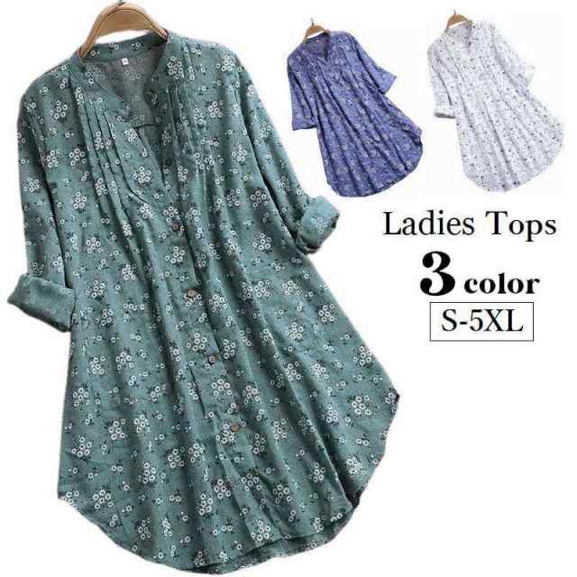 チュニック ブラウス ロング丈 長袖 レディース トップス バンドカラー 前開き 前ボタン 花柄 総柄 体型カバー 婦人服 女性 大きいサイズあり 可