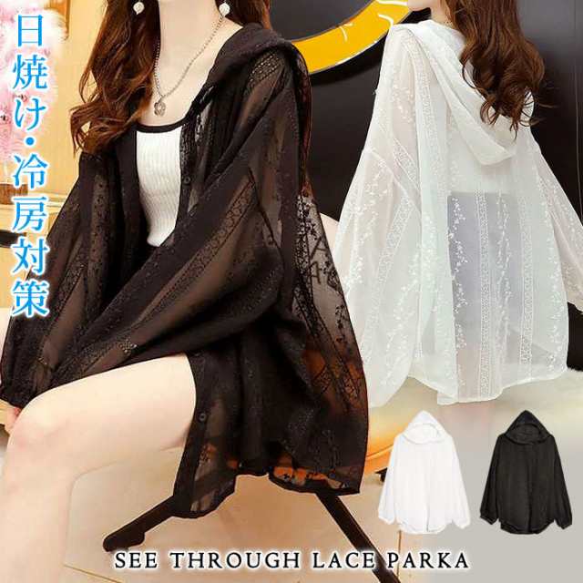 パーカー レディース 春 夏 春夏 白 黒 シースルーパーカー シースルー レース きれいめ 長袖 ライトアウター 透け レースパーカー フード付き 体型カバー アウター ブラック ホワイト シャツ オフィス 大人 20代 30代 40代 OL ママ 母