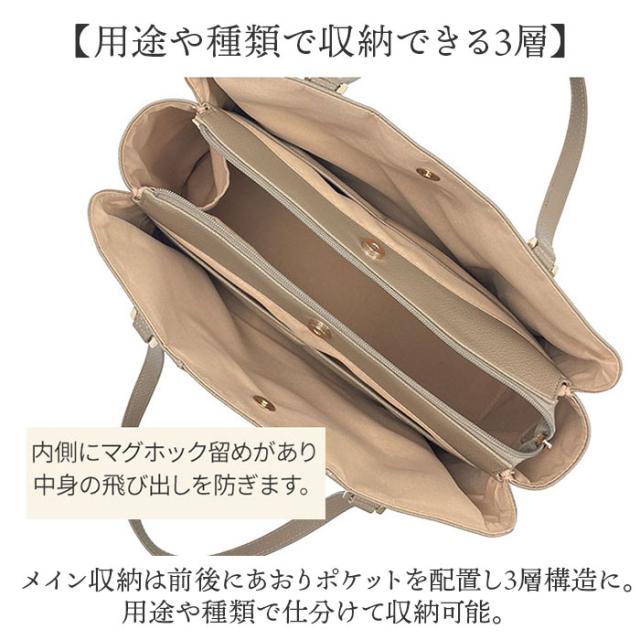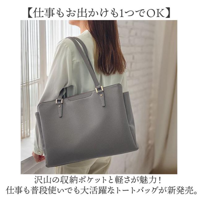 | 商品説明 | 【仕事もお出かけも1つでOK】 ・沢山の収納ポケットと軽さが魅力!仕事も普段使いでも大活躍なトートバッグが新発売。 【嬉しい多ポケット搭載】 ・細かな小物がすっきり整頓しながら収納できるポケットを搭載。 【用途や種類で収納できる3層】 ・メイン収納は前後にあおりポケットを配置し3層構造に。用途や種類で仕分けて収納可能。 【タブレットの収納も可能】 ・クッション入りのポケットも付いているので、タブレット機器の収納も安心。 【大切な書類やパンフレットも】 ・A4サイズのファイルが入るので、書類やパンフレットを折り曲げずに入るのも嬉しいポイント 【スマホやパスケースの収納に】 ・6.1インチのスマホやパスケースが丁度よく収まるアウトポケットを配置。 【肩に掛けて持ち運びラクラク】 ・ハンドルは長めに設計されて肩掛けが可能。荷物が多い日も持ち運び楽ちん。 【底鋲付きで安定して置ける】 ・しっかりとした作りと底鋲付きで、床や椅子などに自立して置けるのもGOOD。 【オフィスコーデにも対応】 ・レザー調の見た目でラフすぎず、オフィスコーデとも相性抜群♪ 【毎日使える軽さ】 ・大きめなながら軽い作りなので毎日使っても負担にならないのも魅力的。 【ポケット仕様】 ・メインルーム・・・ファスナーポケット×1、タブレットポケット×1、ホルダーポケット×1 ・あおりポケット(1)・・・オープンポケット×2 ・あおりポケット(2)・・・オープンポケット×2 ・外側・・・オープンポケット×1 |