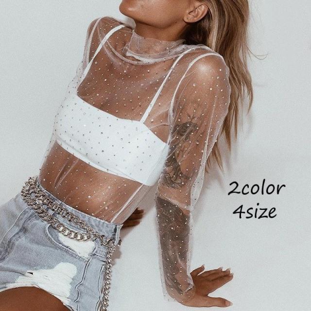 シースルートップス カットソー スパンコール ラメ 長袖 透け感 シースルー 薄手 セクシー ボトルネック ハイネック