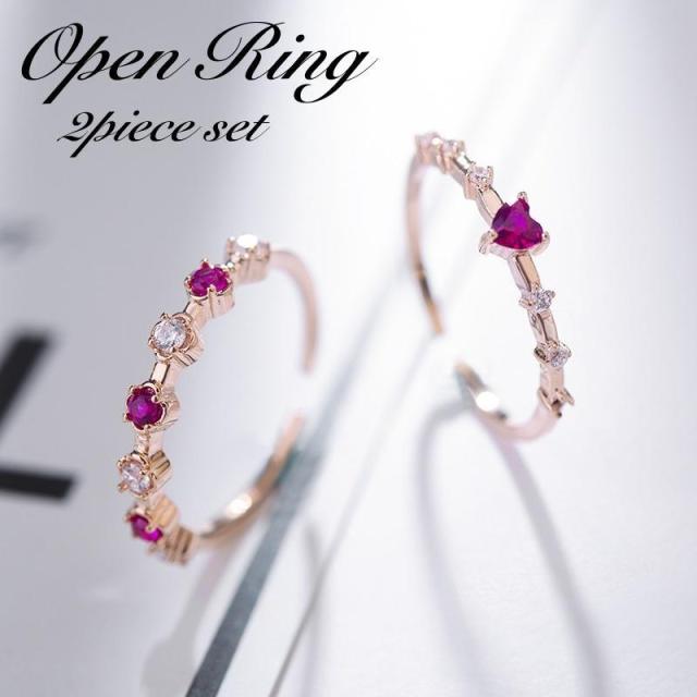 指輪 オープンリング 2個セット レディース 女性 アクセサリー 重ね付け 二連 ラインストーン カラーストーン ハート ゴールドカラー お洒落 可愛