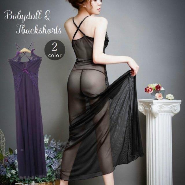 透け感のあるレース素材がセクシーなロング丈のベビードール&Tバックショーツの2点セット。