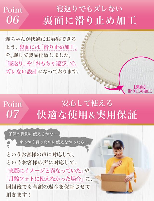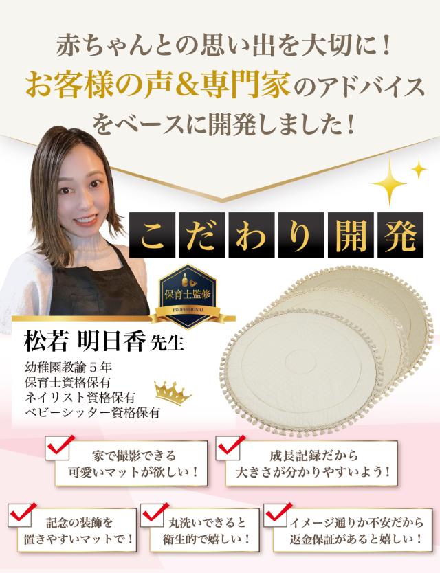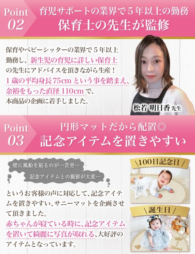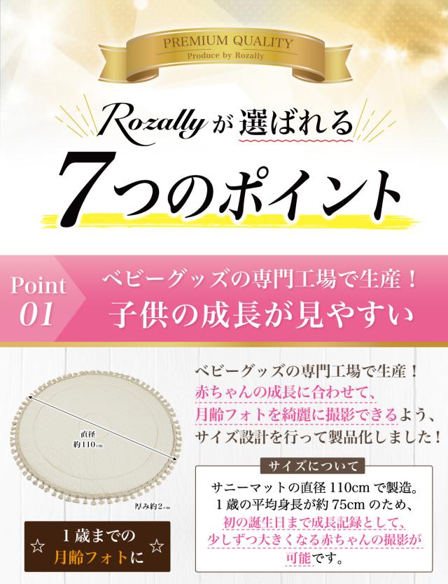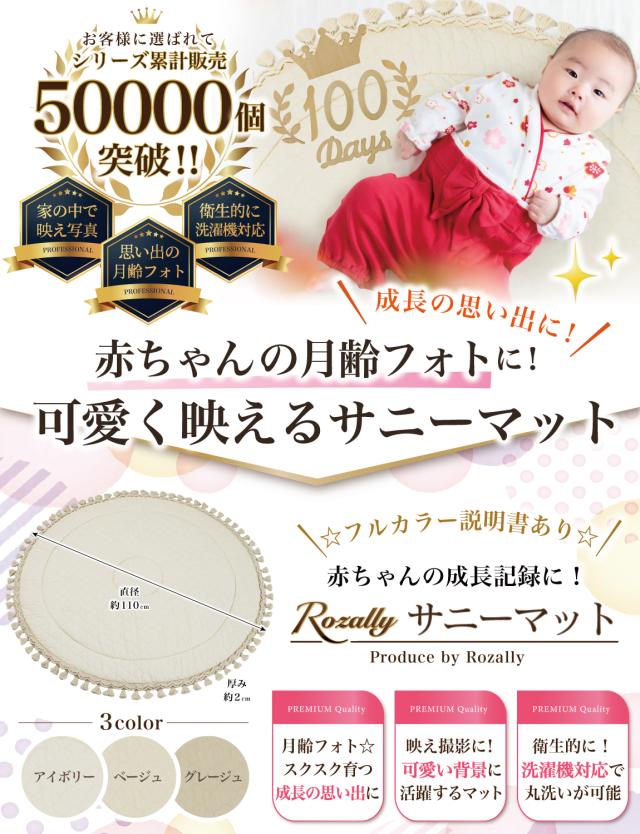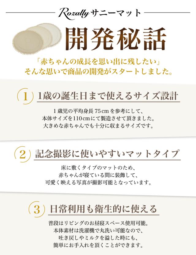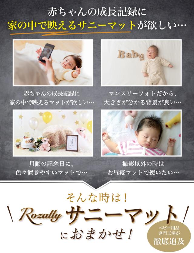 Rozally サニーマット がついに正式販売開始。 「月齢フォトの映える背景に…」「ベビーマットとしてお昼寝に使いたい…」という お客様の声から生まれた 「記念撮影で大活躍」 の 洗える サニーマットです。 リビングに敷いて お昼寝マット や プレイマットとして使用できるのも人気の1つです。 「お七夜」「お宮参り」「初節句」「百日祝い」「お食い初め」「初誕生日」などの、 赤ちゃんの成長記録として記念写真に大人気のイブルマットとなっています。 「ごろ寝」している可愛い寝相を今話題のごろ寝アートとして、 記念写真に残しておくのも大切な思い出になります。 企画&設計では 新生児 や 乳幼児 など 赤ちゃん の育児に詳しい【保育士】の先生からアドバイスをもらい、衛生的に使えるよう丸洗い可能な素材選定を行いました。 シンプルで可愛いデザインに仕上げたため出産準備や出産祝いなどギフトにも最適になっています。 |