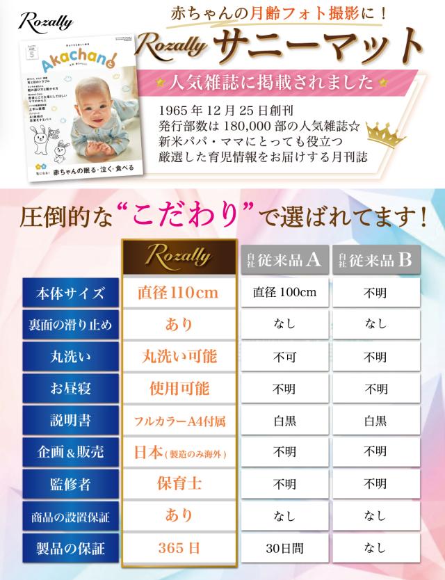 様々なメーカーから サニーマット や イブルマット として” ベビーマット ”が販売されていますが、Rozallyの サニーマット は”こだわり”が一味違います。 赤ちゃん用品をメインに取り扱っている10社以上の工場からサンプルを取り寄せ、「快適な寝心地×映える円形マット」を一緒に試行錯誤して頂けた1社に絞って発注を行なっています。 |