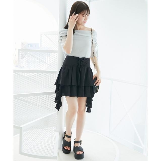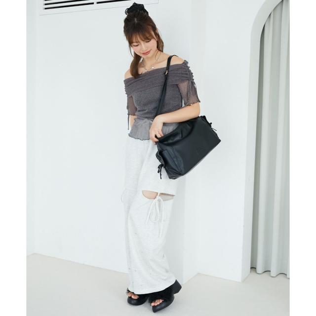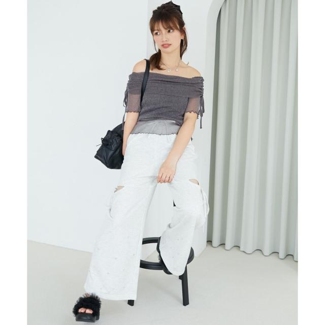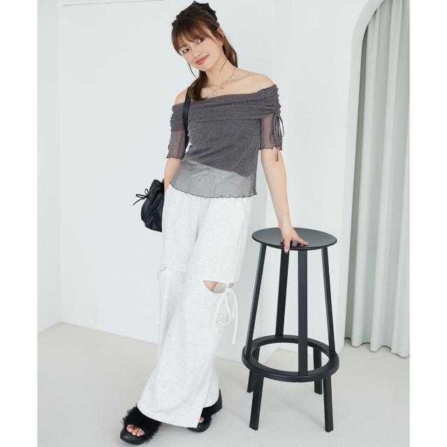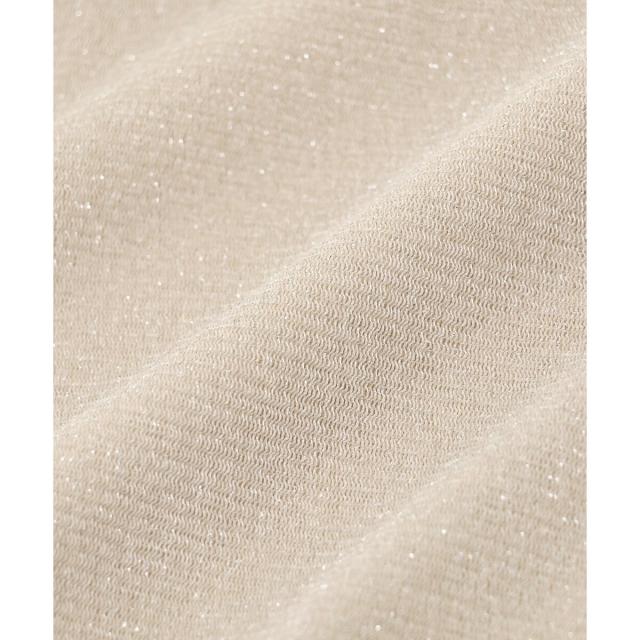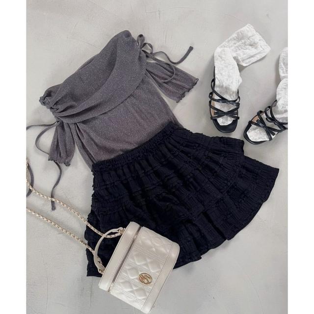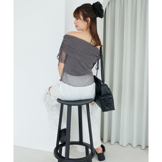 さりげなく輝く大人っぽいラメチュールにデコルテ美人を叶えるオフショルダーデザインがトレンドムードたっぷりのトップス。