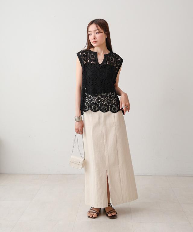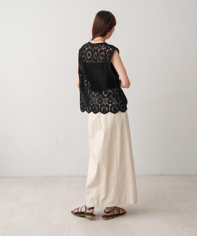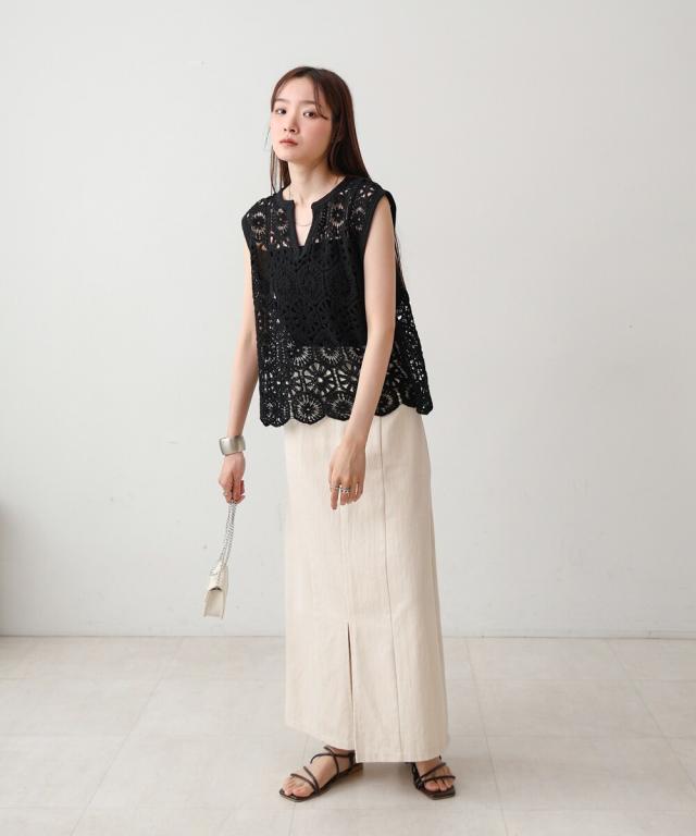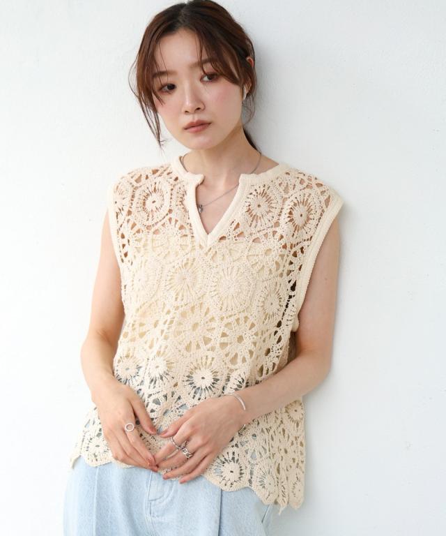 今年も大人気のクロシェシリーズに新型のベストタイプが登場しました!繊細なクロシェ編みのモチーフが印象的な1枚でコーデに取り入れるだけで今年っぽいスタイルが実現します。身頃だけでなく衿ぐりなどもレース編み機で仕上げたパイピング始末で仕上げているので高見えすること間違いなし。肩巾を大きめにして衿ぐりをスキッパー開きにしているので華奢見えするベストになっています。