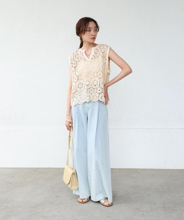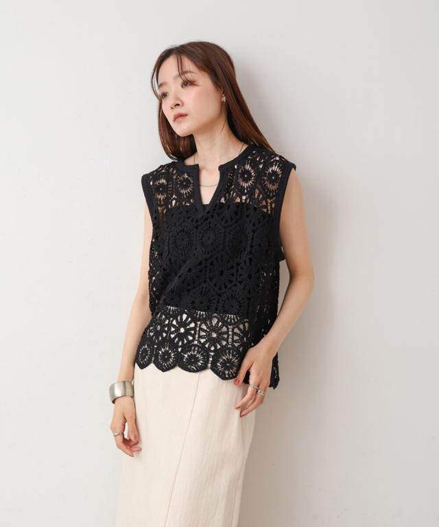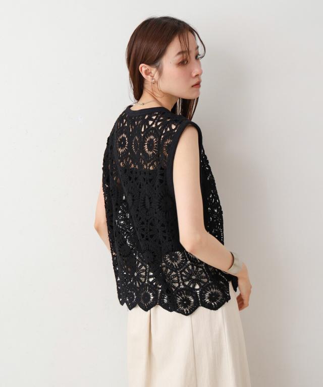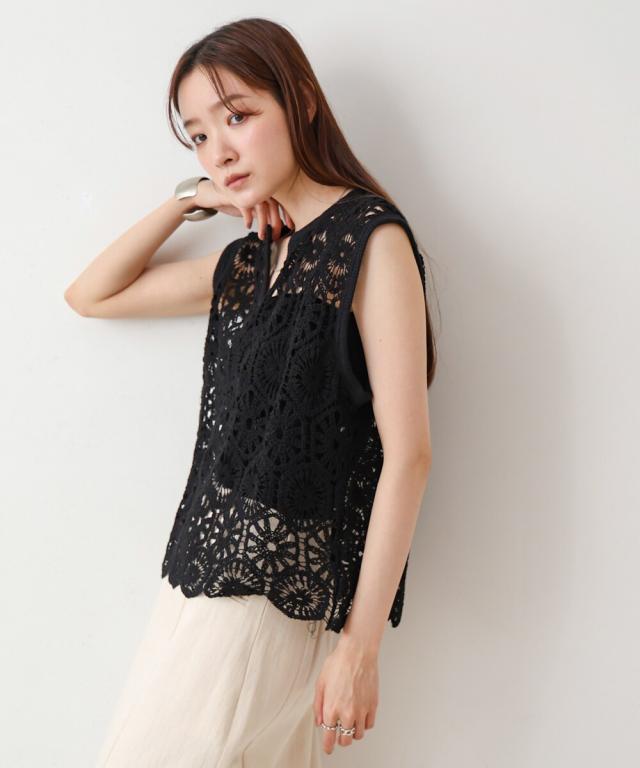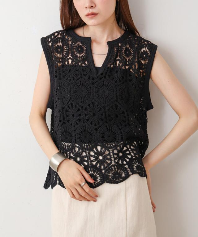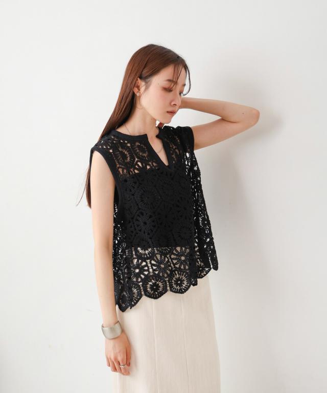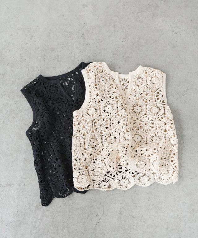 フラワーモチーフのクロシェ編みがさらっとした肌ざわりでストレスフリーな1枚です。繊細なクロシェ編みの為、引っ掛けには充分ご注意ください。