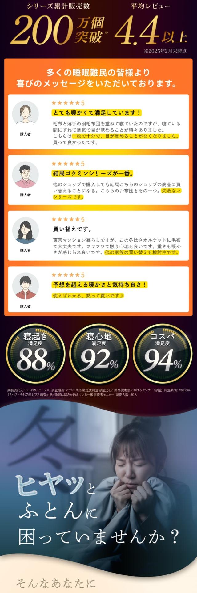 人生の1/3の時間を占める「睡眠」を徹底的に研究し、極上の眠りと、翌朝の目覚めさえもよりよくする寝具を作りたいという思いで企画開発。「高価な寝具には劣らない品質」と「寝心地」で、手に取って頂いた後も末永くご満足いただける商品を提供いたします。