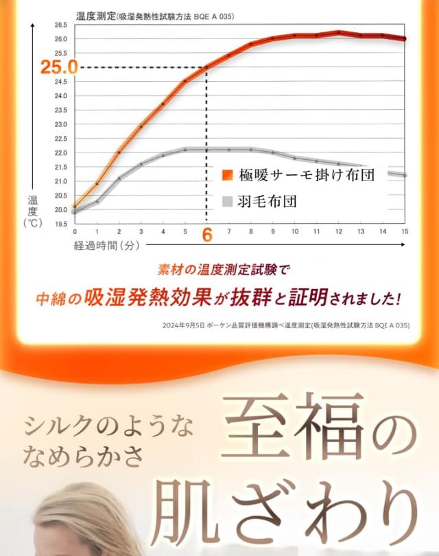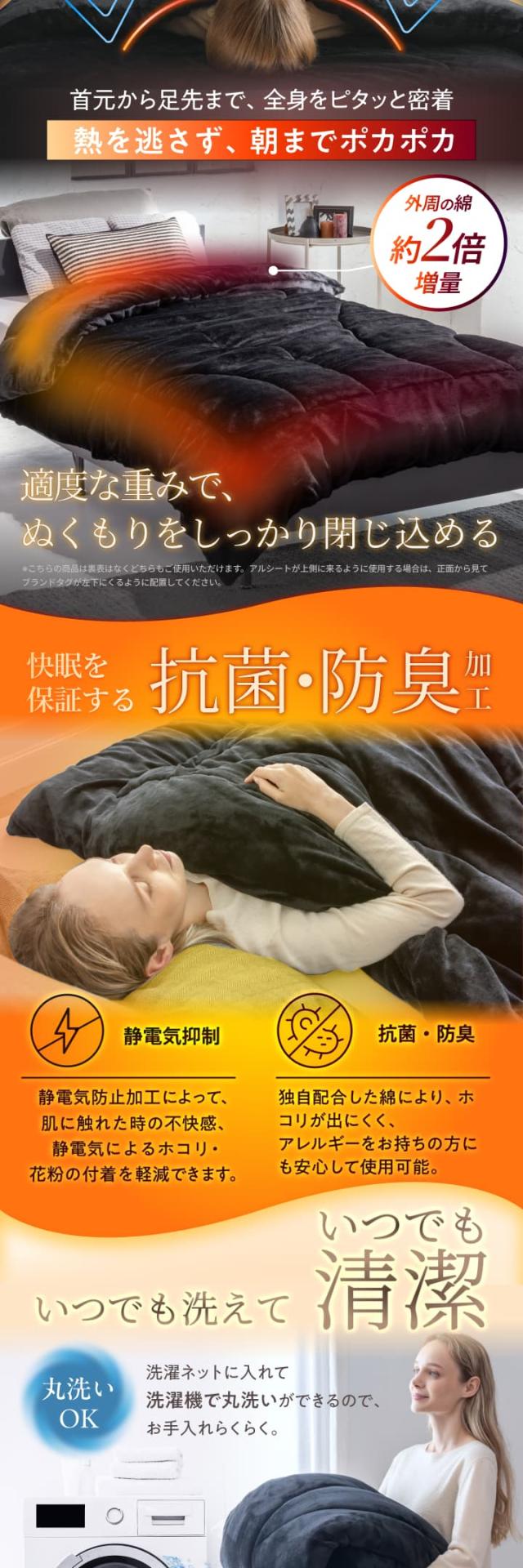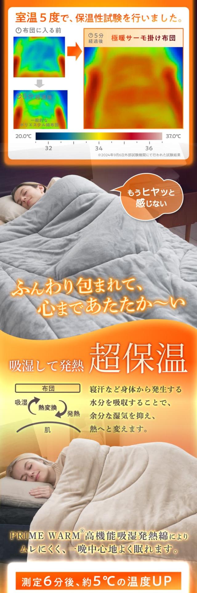 吸湿発熱素材が寝汗や湿気を吸収し、わずか約6分で+5℃の発熱効果を発揮。ムレにくく、あたたかい空気をしっかり布団内に留めるので、冬の夜でも心地よい温度が持続します。