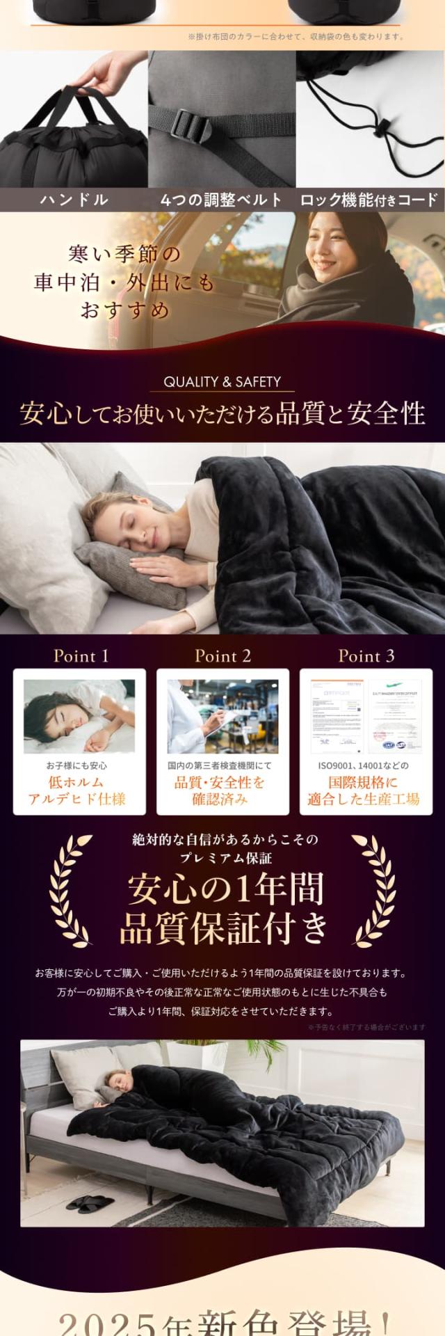 | 素材 | ・材質 :側生地:ポリエステル85%,レーヨン15% ・アルミシート:ポリエステル99.5%,アルミニウム0.5% ・中綿:ポリエステル80%,アクリルレート20%(吸湿発熱綿) ・収納袋:ポリエステル100% |