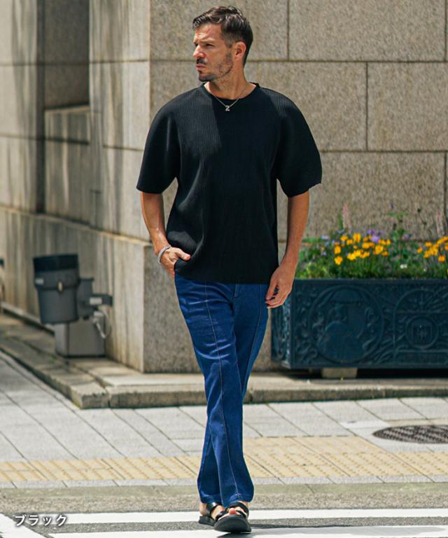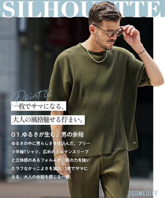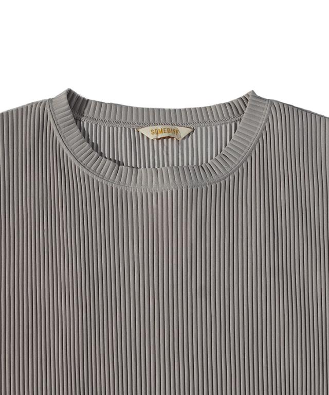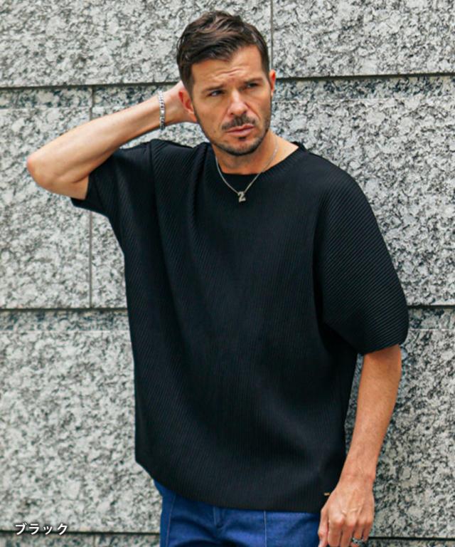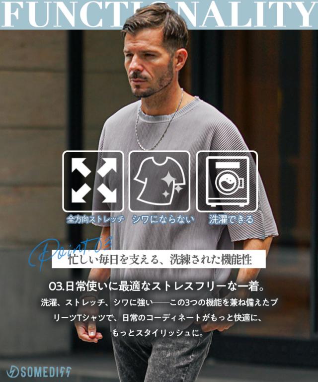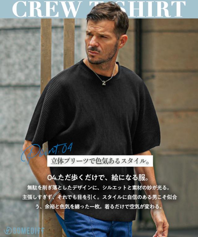 SOMEDIFF(サムディフ)『プリーツクルーネック半袖Tシャツ』【プリーツクルーネック半袖Tシャツ】■Design/デザインひと味違う、プリーツ素材のクルーネックTシャツ。表面に立体感のあるプリーツ加工を施した、存在感ある一枚。しっとりとした上質な素材をたっぷりと使用し、夏でも心地よく着られる清涼感を実現しました。凹凸のある生地は肌への接触を最小限に抑え、一般的なTシャツにはない“涼しさ”を体感できます。縦方向に入ったプリーツが、シャープでスタイリッシュな印象を演出。また、ゆったりとしたオーバーサイズシルエットで、体型を問わずリラックスして着用いただけます。機能性とデザイン性を兼ね備えた、大人のための夏Tシャツです。