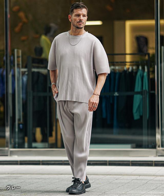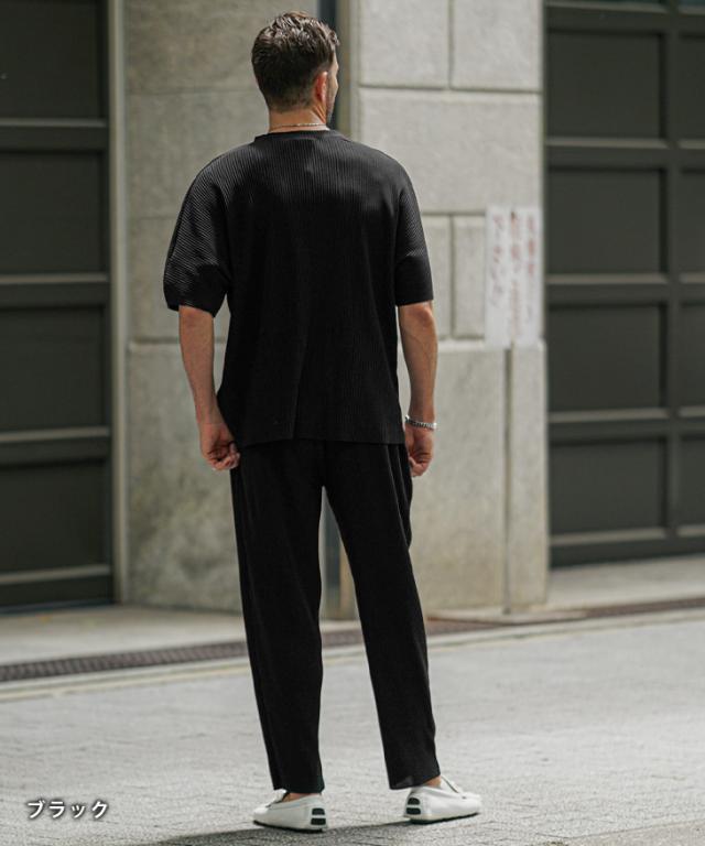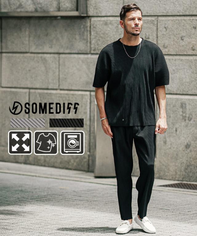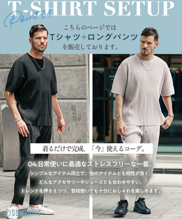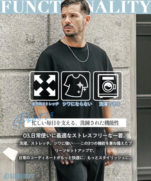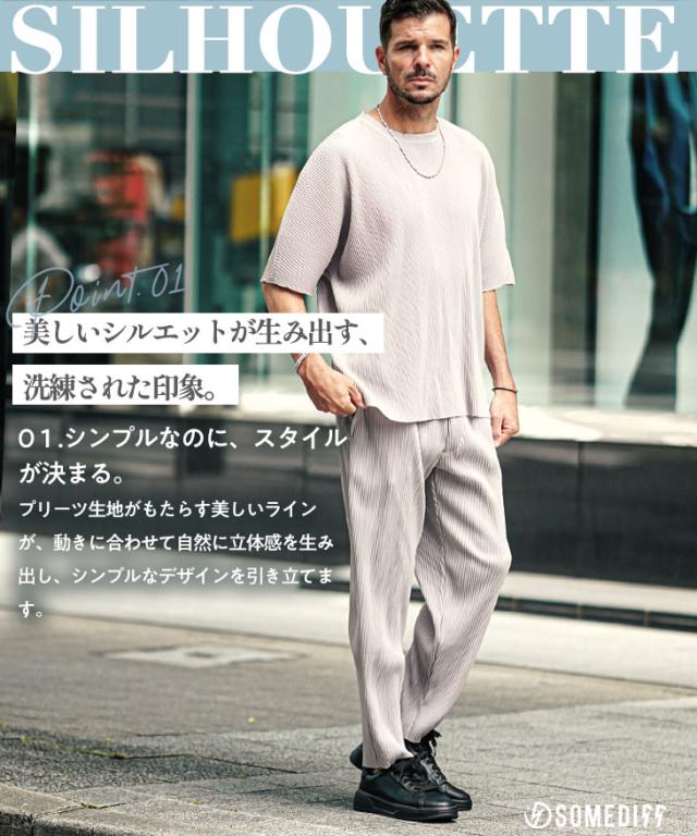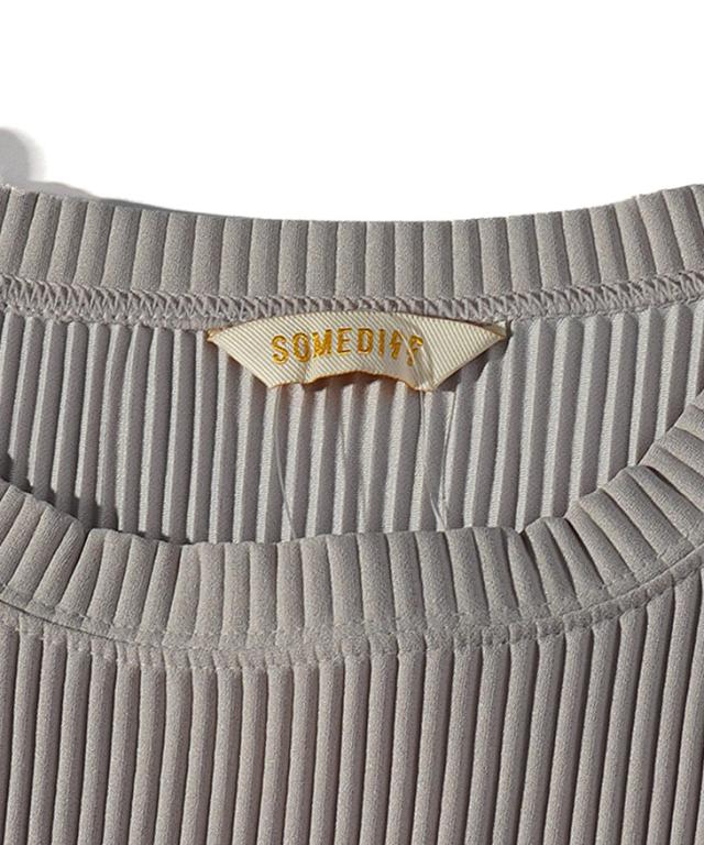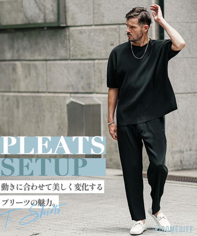 SOMEDIFF(サムディフ)『プリーツTシャツセットアップ』【プリーツTシャツセットアップ】■Design/デザイン軽やかで上品。肩の力を抜いた大人のためのセットアップ。細かなプリーツが生み出す縦のラインが、すっきりとした印象をつくりながらも、着心地はとてもやわらか。リラックスして過ごしたい日にも、きちんと見せたい日にも頼れる一着です。生地はしっとりと肌に馴染み、シワになりにくいので、普段使いはもちろん、旅先にもぴったり。セットで着ればコーデが即完成。もちろん上下それぞれ単体でも着回しやすく、毎日の装いに活躍してくれます。上品さとラクさをどちらも叶えてくれる、毎日に寄り添うアイテムです。