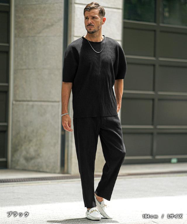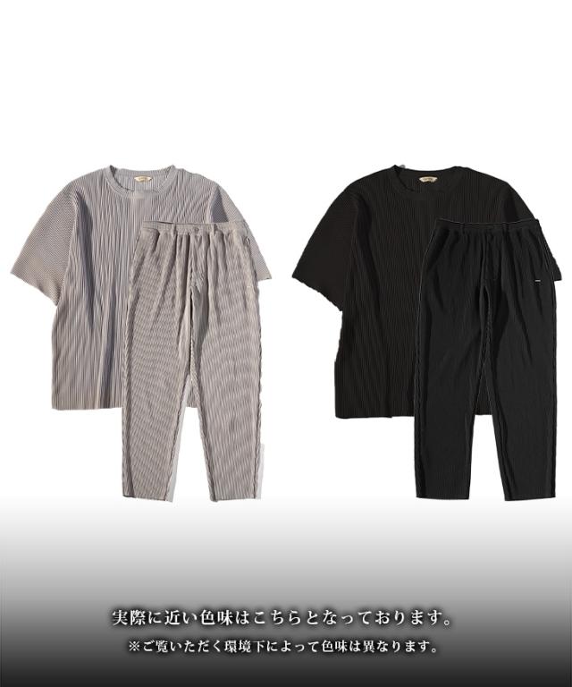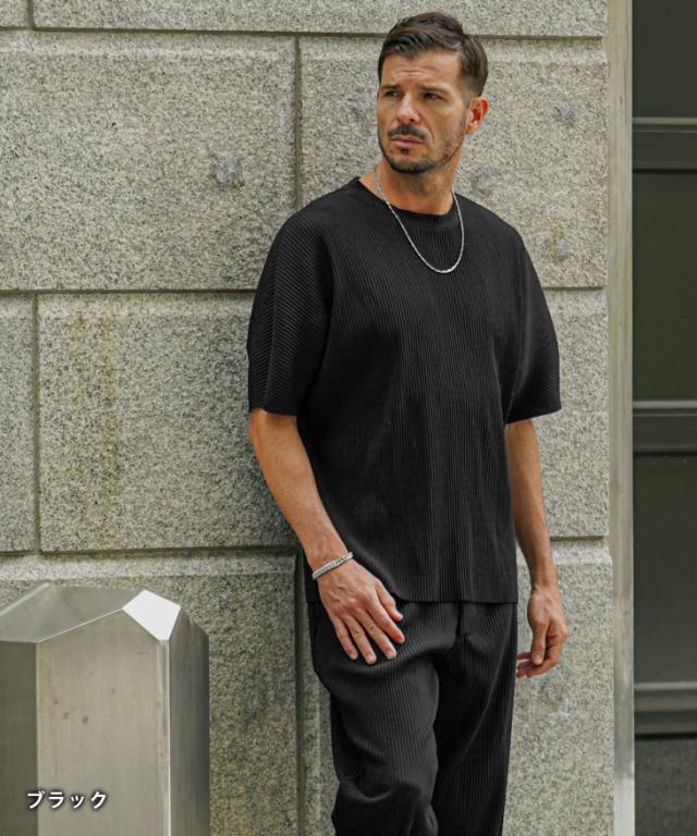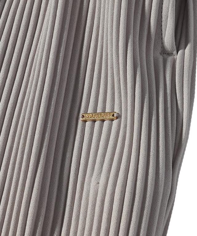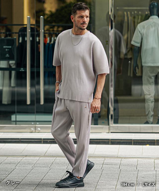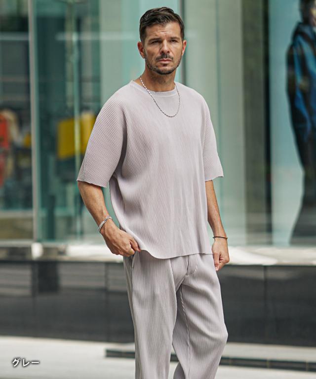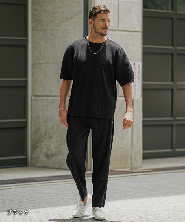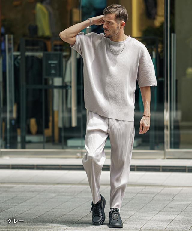 SOMEDIFF(サムディフ)『プリーツTシャツセットアップ』【プリーツTシャツセットアップ】■Design/デザイン軽やかで上品。肩の力を抜いた大人のためのセットアップ。細かなプリーツが生み出す縦のラインが、すっきりとした印象をつくりながらも、着心地はとてもやわらか。リラックスして過ごしたい日にも、きちんと見せたい日にも頼れる一着です。生地はしっとりと肌に馴染み、シワになりにくいので、普段使いはもちろん、旅先にもぴったり。セットで着ればコーデが即完成。もちろん上下それぞれ単体でも着回しやすく、毎日の装いに活躍してくれます。上品さとラクさをどちらも叶えてくれる、毎日に寄り添うアイテムです。