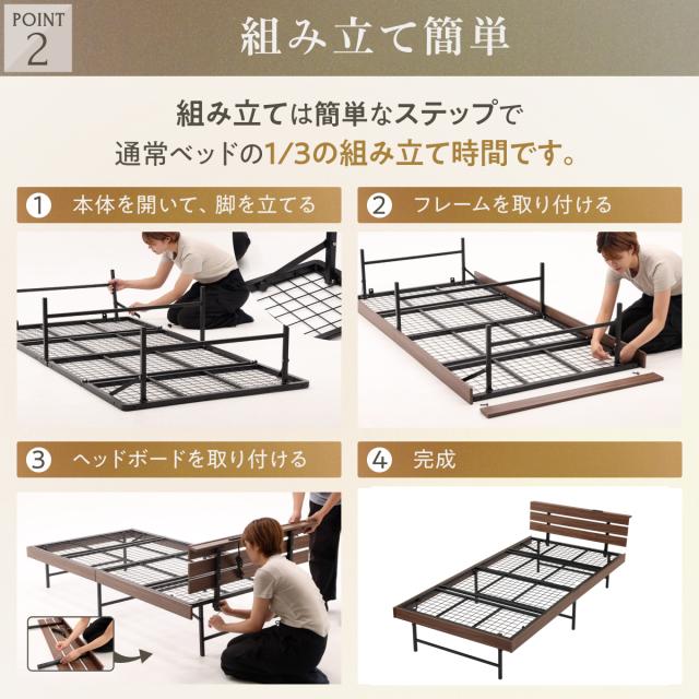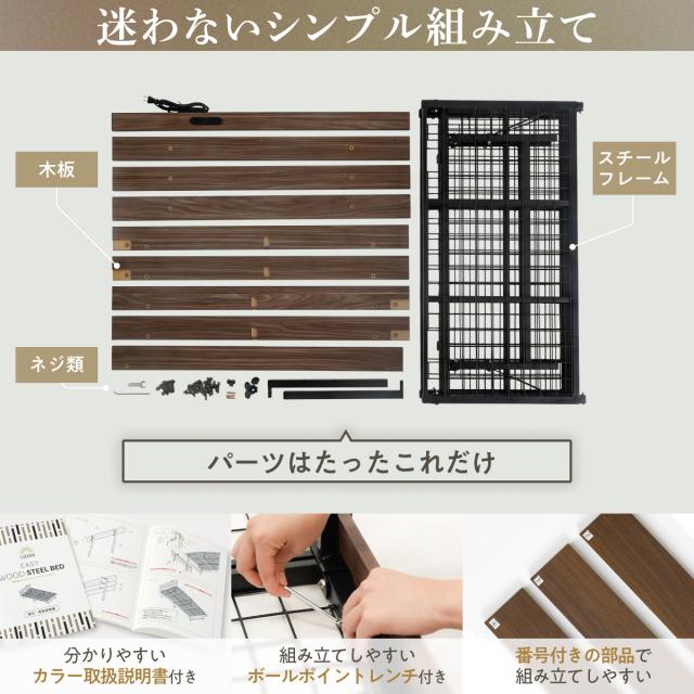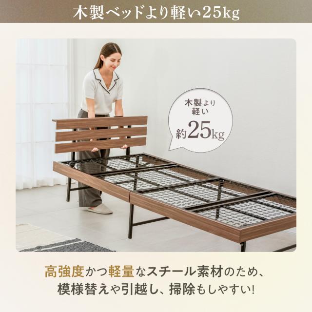 折りたたみ式スチールベッドに木板を取り付けるシンプルで軽量な構造により、誰でも簡単に組み立てが可能。マットレスを置けば、木製ベッドのような温かみを感じる外観で、理想の寝室を演出します。