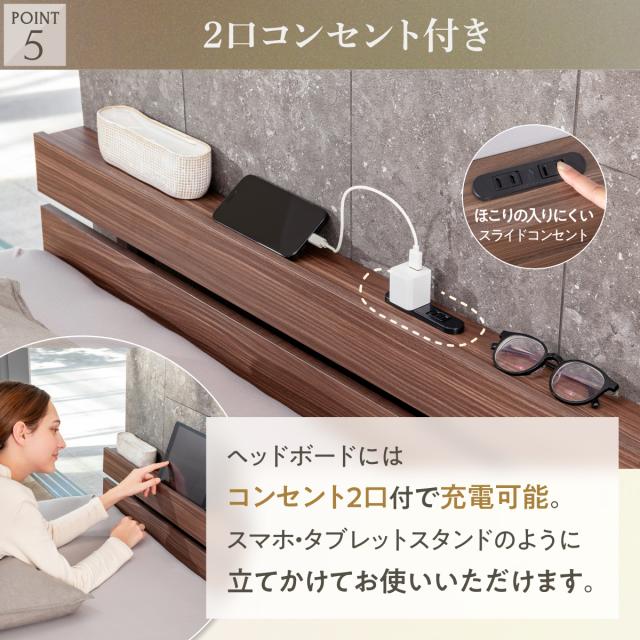 宮棚には2口コンセント付きで、枕元でスマホやタブレットを充電可能。ケーブル類はヘッドボード背面にすっきり収納。