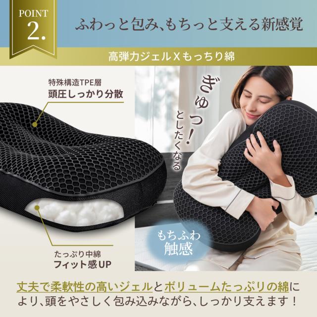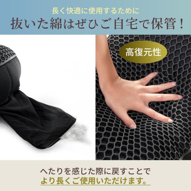 丈夫で柔軟性のあるジェルが適度な反発力を発揮し、ボリュームたっぷりの綿が包み込むような柔らかさを提供。頭を包み込みながら、圧力をしっかり分散します