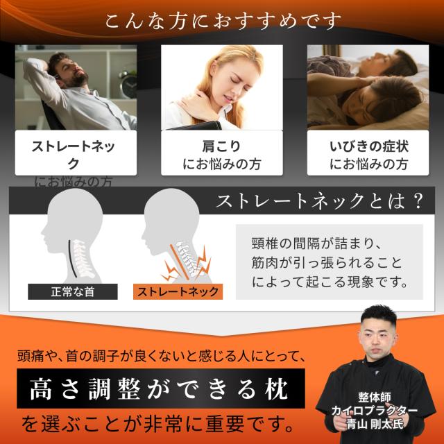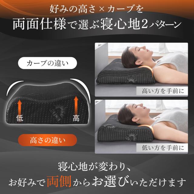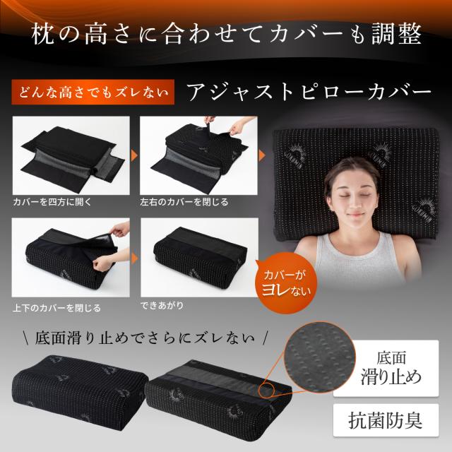 枕本体には活性炭を配合し、気になる汗のニオイの元をブロック。カバーは高さに合わせてサイズ調整可能。枕本体と高さ調整シートにはズレ防止のためのマジックテープが付属し、ズレにくく快適です。