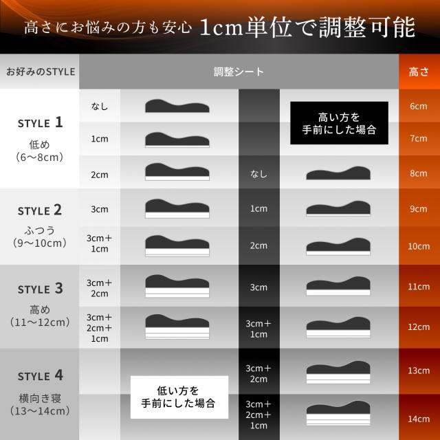 1cm/2cm/3cmと厚み違いの3枚の高さ調整シートで6cm~14cmまで、1cm単位で9段階の高さ調整が可能に。