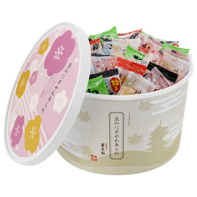 和をイメージしたかわいいパッケージに、色んな味のあられをいっぱい詰め込みました。ご家族やご友人で楽しめる、にぎやかなギフトです。