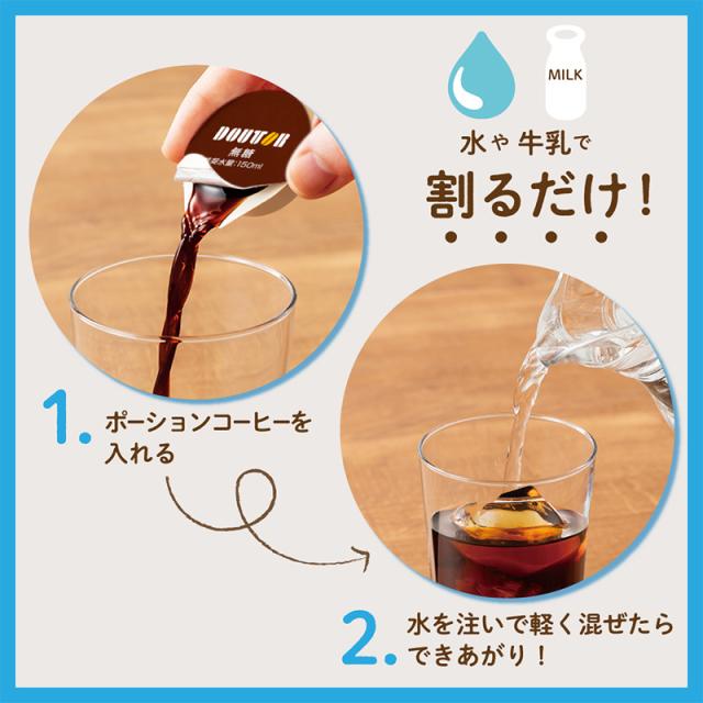 水やお湯、牛乳と混ぜるだけで誰でも手軽においしいコーヒーが作れる、1杯分の希釈用ブラックコーヒーです。アイスでもホットでもお楽しみいただけます。