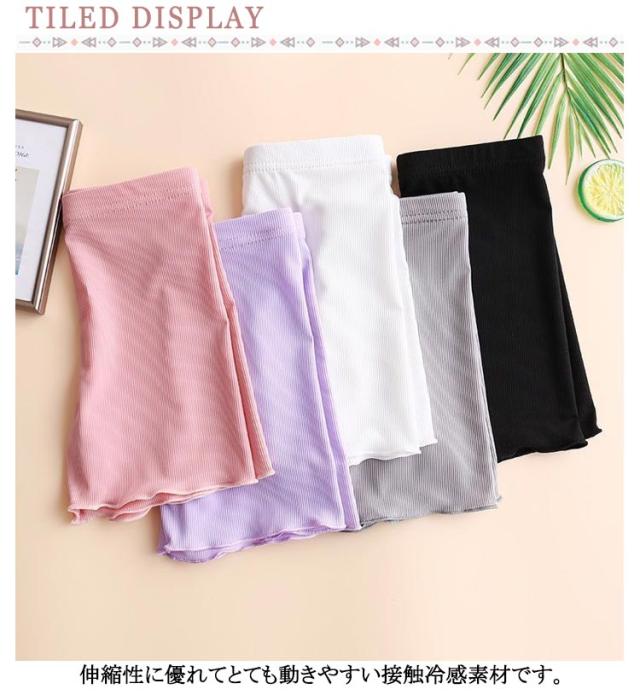 | 【4枚組】【ひんやり冷感】【3分丈スパッツ】【110〜170cm】 伸縮性に優れてとても動きやすい接触冷感素材です。 かさばらない薄手の生地でズボンにも、スカートの下にもばっちりの着心地です。 フリル裾のデザインで、ガーリー度たっぷり! 窮屈さやムレはなく、とっても快適な履き心地〜 柔らかくて通気性があり、締め付け感もなく、着心地抜群! | |
