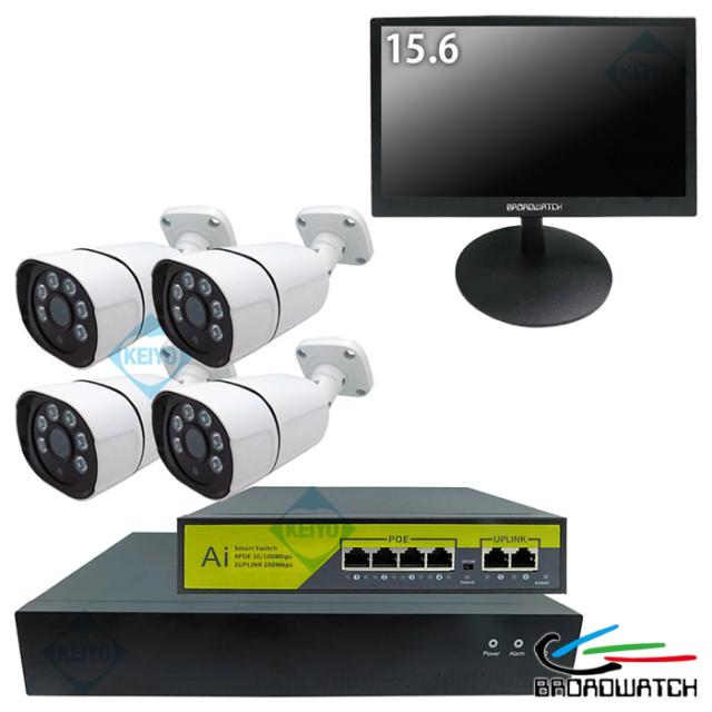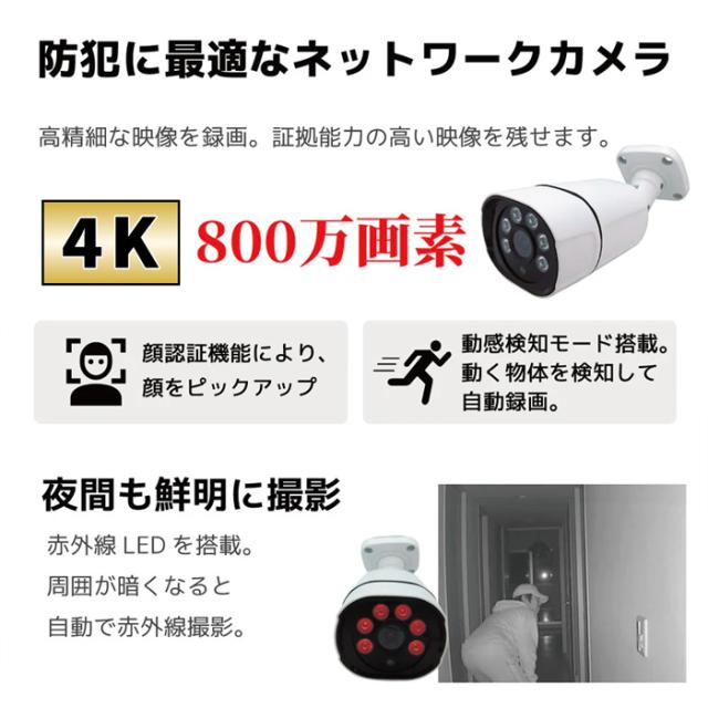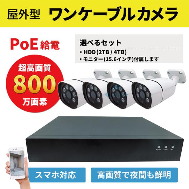 SEC-N-4K-16Lは、800万画素屋外用ワンケーブルバレット型防犯カメラ4台と、リンクポート付4ポートハブ1台、HDD録画機1台、15.6インチモニターのセット商品です。