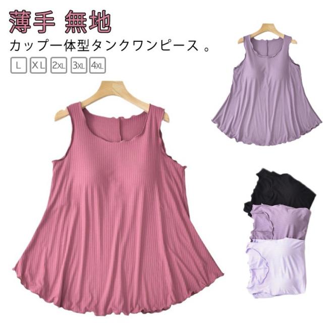 カップ付き タンクトップ タンクワンピース レディース チュニック 無地 ノースリーブ 夏 薄手 無地 インナー トップス カジュアル 寝間着 部屋着 大人 ラウンドネック タンク キャミ トップス 大きいサイズ 送料無料