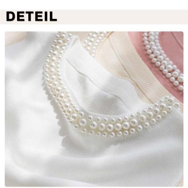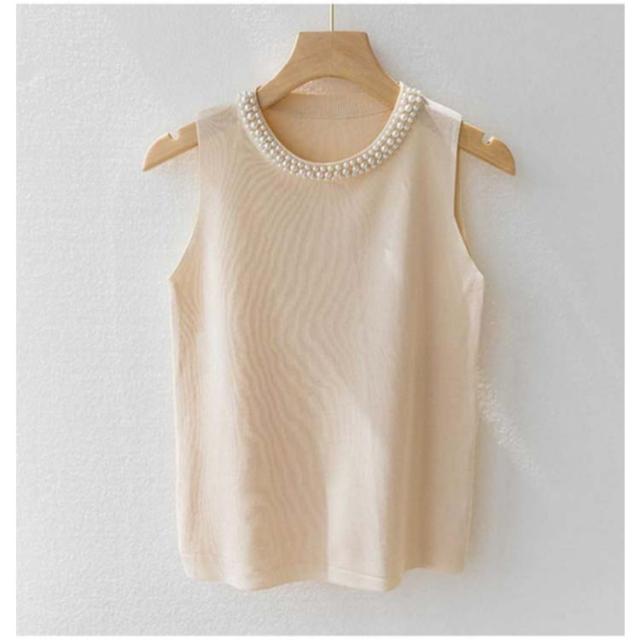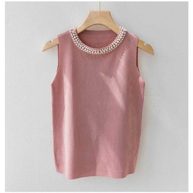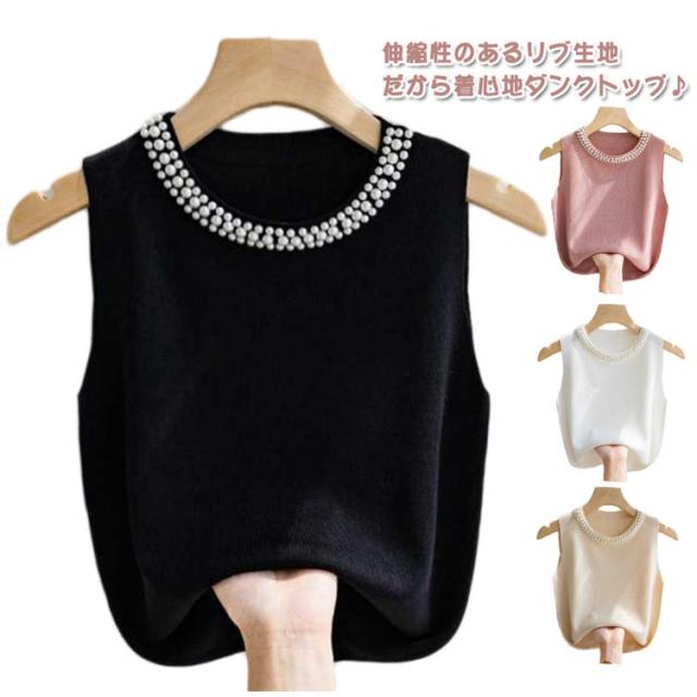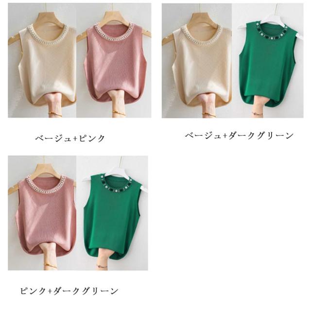 【2枚セット】 パール付き ニットトップス ノースリーブ リブニット ニットベスト レディース キャミソール 春夏 サマーニット タンクトップ ラウンドネック カットソー スーツインナー 送料無料 無地 フェミニン きれいめ 大人 通勤 20代 30代 40代 50代