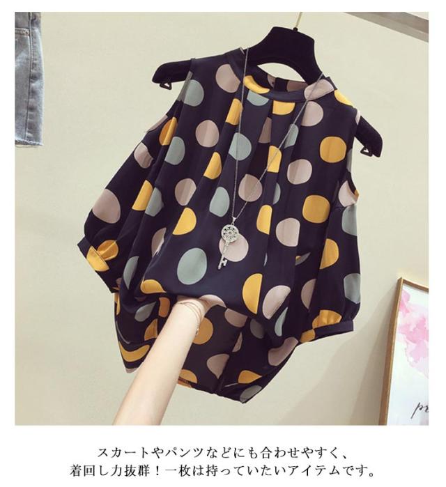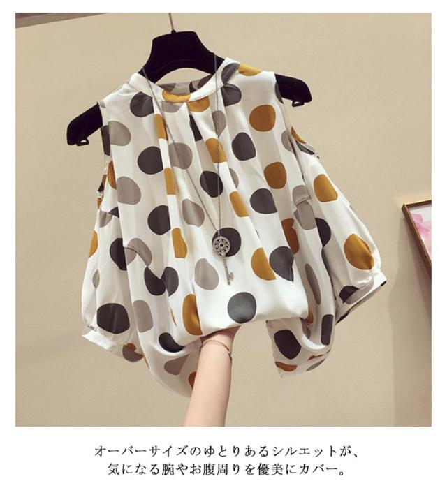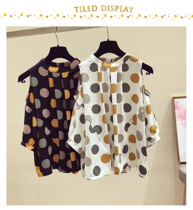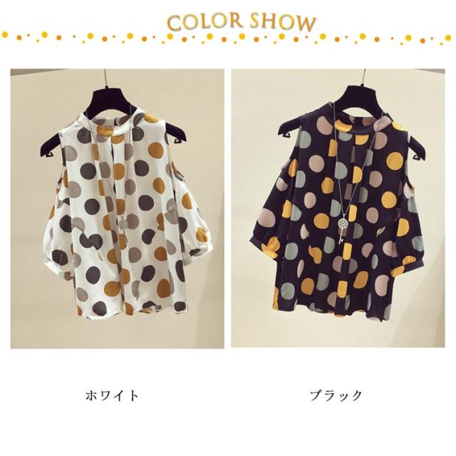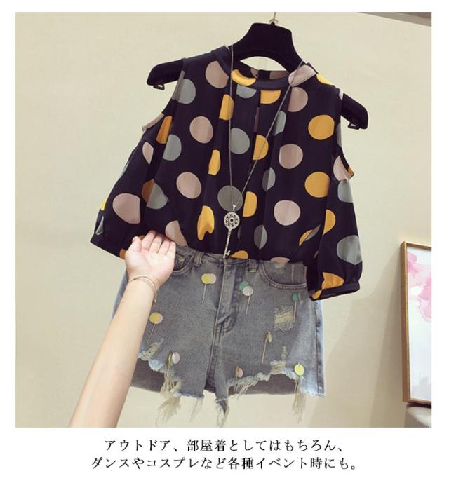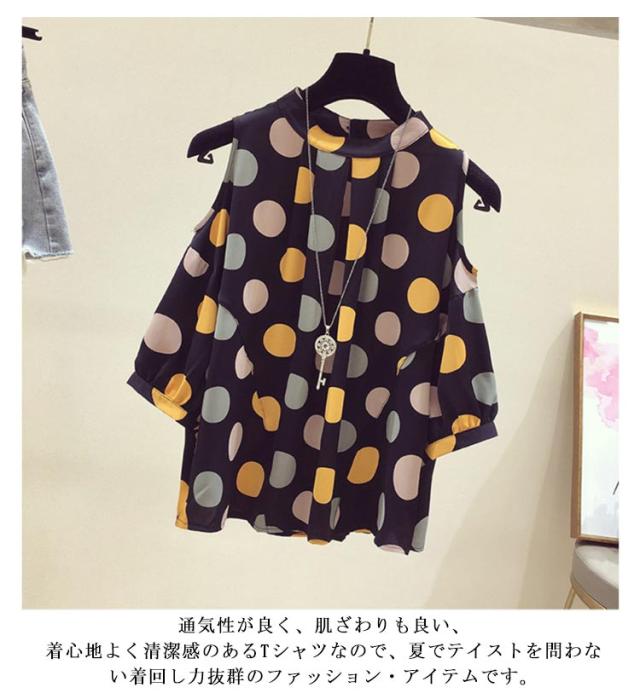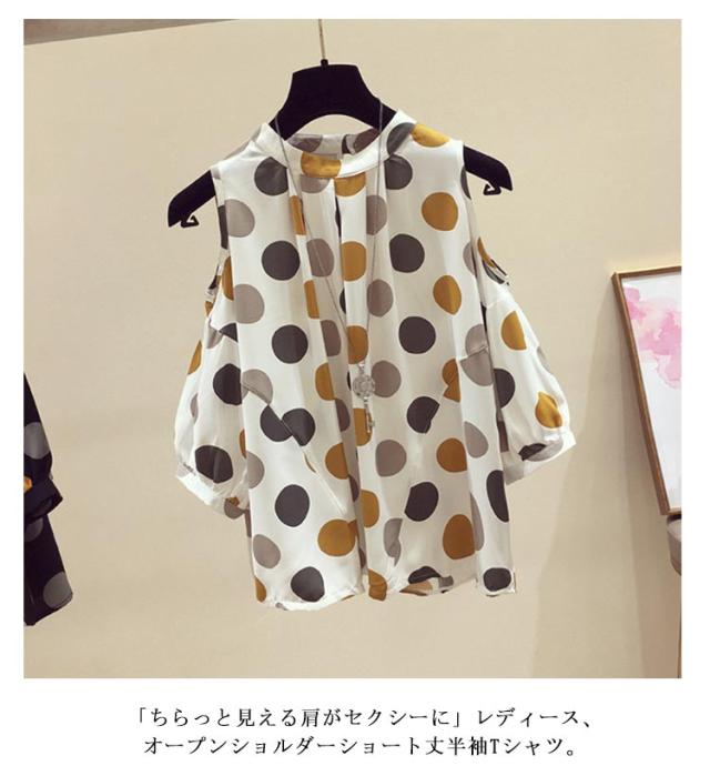 肌見せ ラウンドネック 半袖 Tシャツ 夏 オフショルダー カットソー シフォン Tシャツ トップス オフショル半袖Tシャツ 夏服 半袖tシャツ 肩出し クルーネック ドット柄 五分袖 女性らしい 大人 おしゃれ