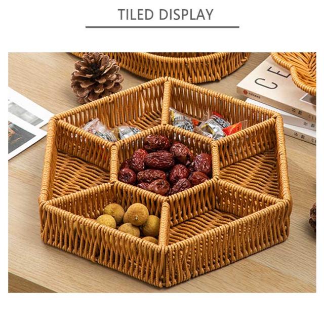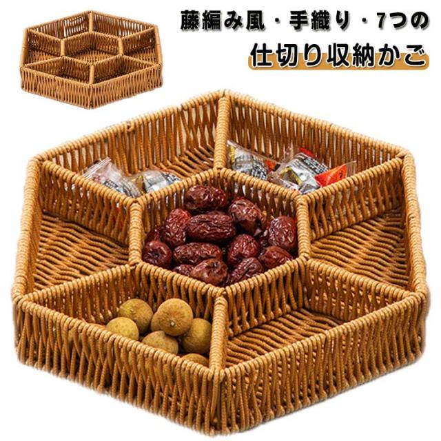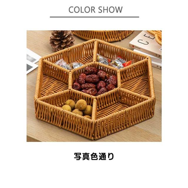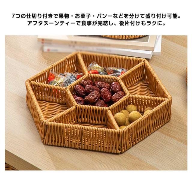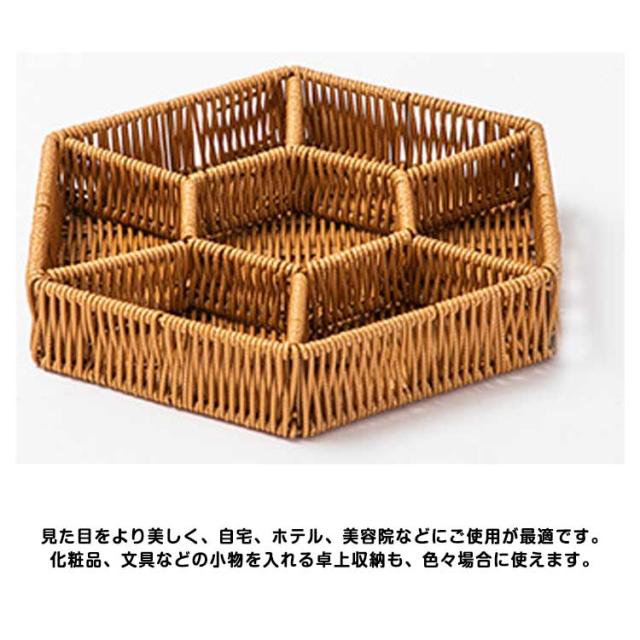 パン ラタンかご 手織りトレー 藤編み風 アフタヌーンティー 田園風 六角形 小物整理 七つ バスケット 藤編み風 仕切り 雑貨収納 和風収納 お菓子 果物 フルーツ 卓上 インテリア 家庭 カフェ レストラン ホテル用