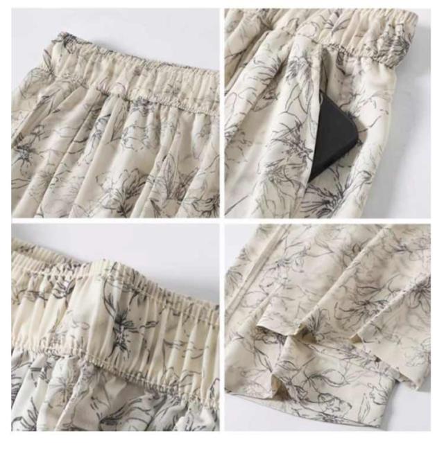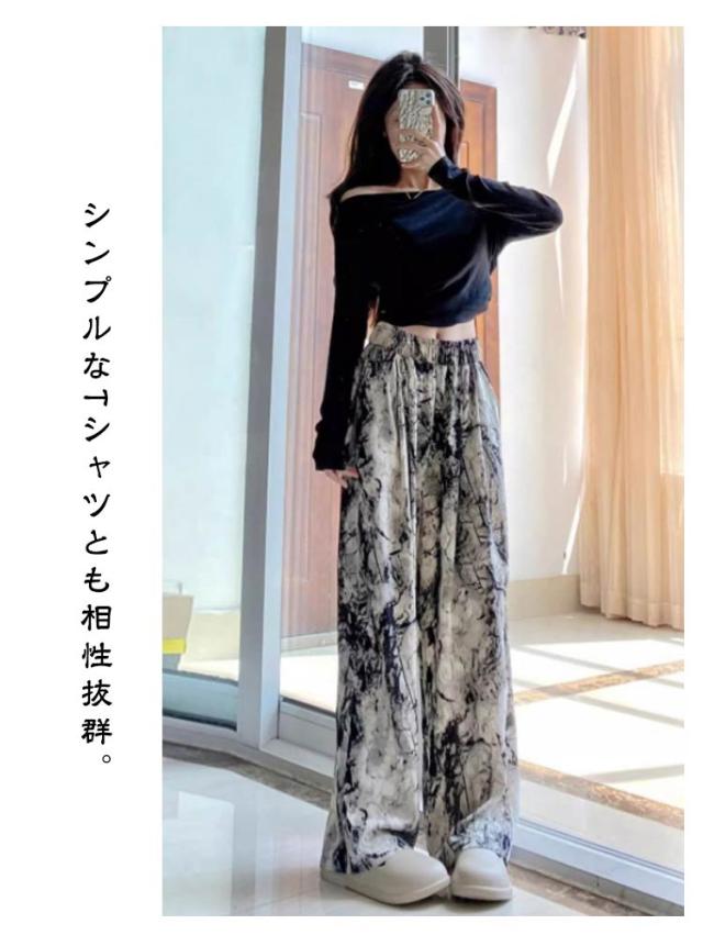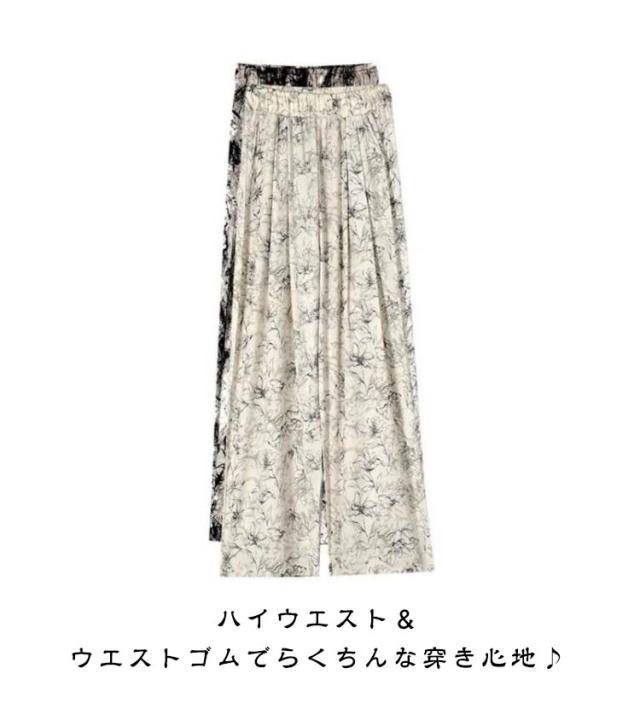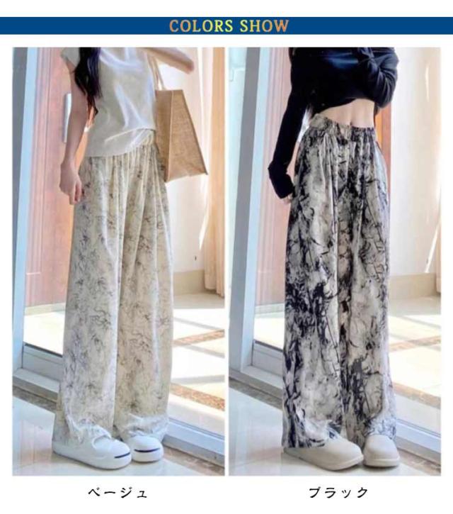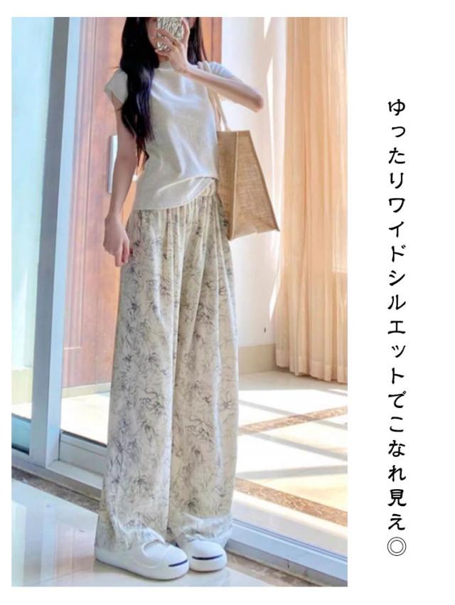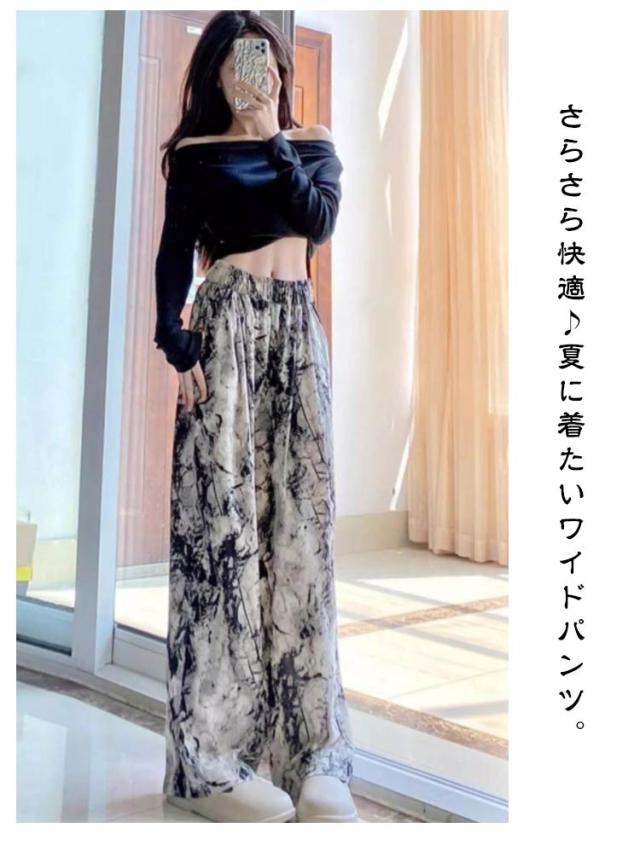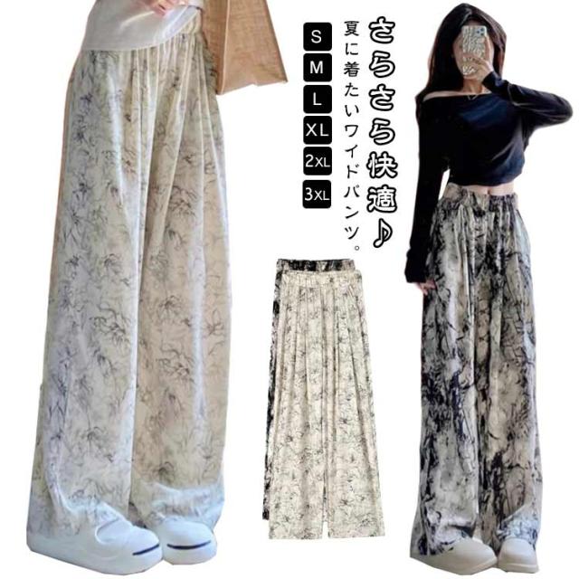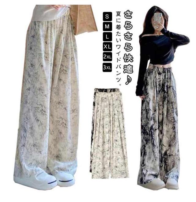 涼しい パンツ ワイドパンツ ワイドパンツ ボトムス 着?せ ゆったり イージーパンツ 接触冷感 薄手 総柄 柄パンツ ロングパンツ ウエストゴム 長ズボン さらさら 美脚 夏 リゾート 旅行 20代 30代