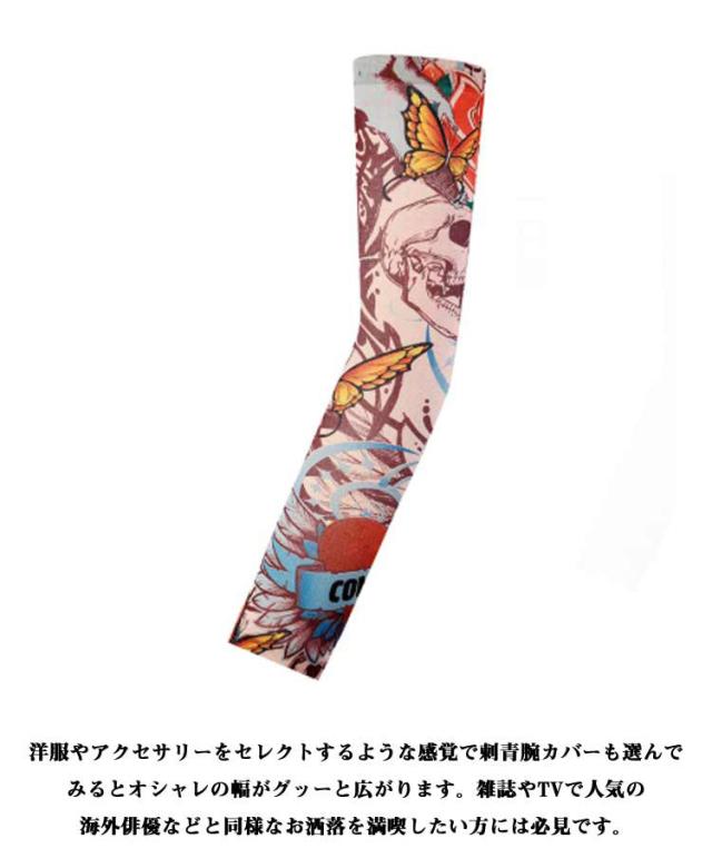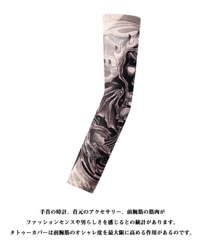 | 【お得な6枚セット!(3種柄入り)】 身体に手彫りする本物のタトゥー(刺青)は、費用面や身体への影響が懸念されます。肝炎などの身体に悪影響、数十万という費用の捻出は金銭面でも大きな負担です。和彫りを身体に入れたい方は、このタトゥースリーブを装着してまずはイメージを掴んで下さい。 夏場のTシャツと合わせてファッショナブルにお洒落を楽しみたい方は、男気溢れた強面イケメンに変身出来ます。冬場はロンTの下に装着し、腕まくりをしてチラッと見せるオシャレさがカッコイイ。女性心を掴むアイテムとしても重宝出来ます。 洋服やアクセサリーをセレクトするような感覚で刺青腕カバーも選んでみるとオシャレの幅がグッーと広がります。雑誌やTVで人気の海外俳優などと同様なお洒落を満喫したい方には必見です。手首の時計、首元のアクセサリー、前腕筋の筋肉がファッションセンスや男らしさを感じるとの統計があります。タトゥーカバーは前腕筋のオシャレ度を最大限に高める作用があるのです。 素材は伸縮性、優れた伸縮効果で腕に吸いつくようなフィット感が特徴です。手首から腕の長さを採寸し標準化したフリーサイズのアームカバー! | |