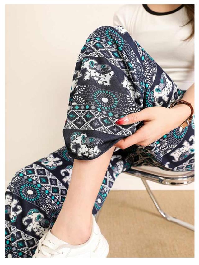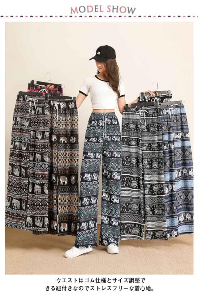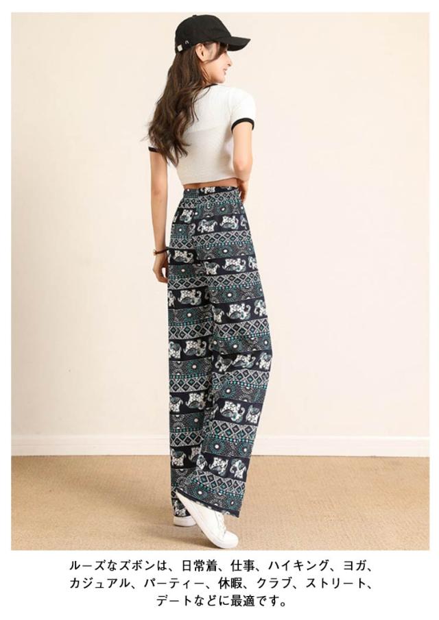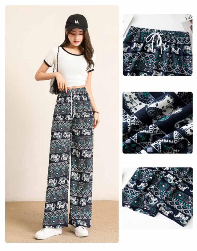 パンツ 柄 とろみ 夏 涼感 冷感 ゾウ ハイウエスト 薄手 パンツ タイパンツ ワイド レディース 総柄 ワイドパンツ 涼しい ルームウェア 部屋着 落ち感 薄手 通気性 体型カバー ロング ゴムウエスト ストレッチ ワイドパンツ おしゃれ