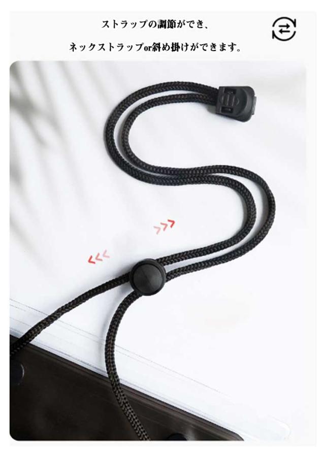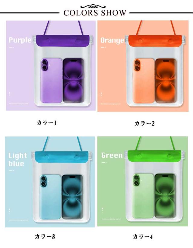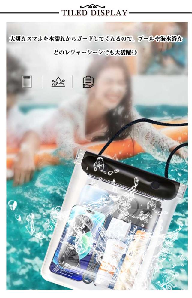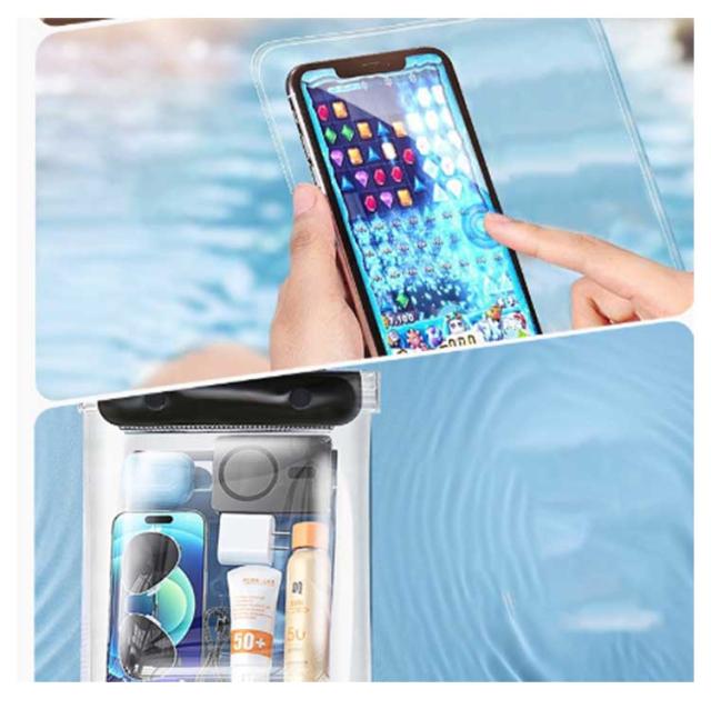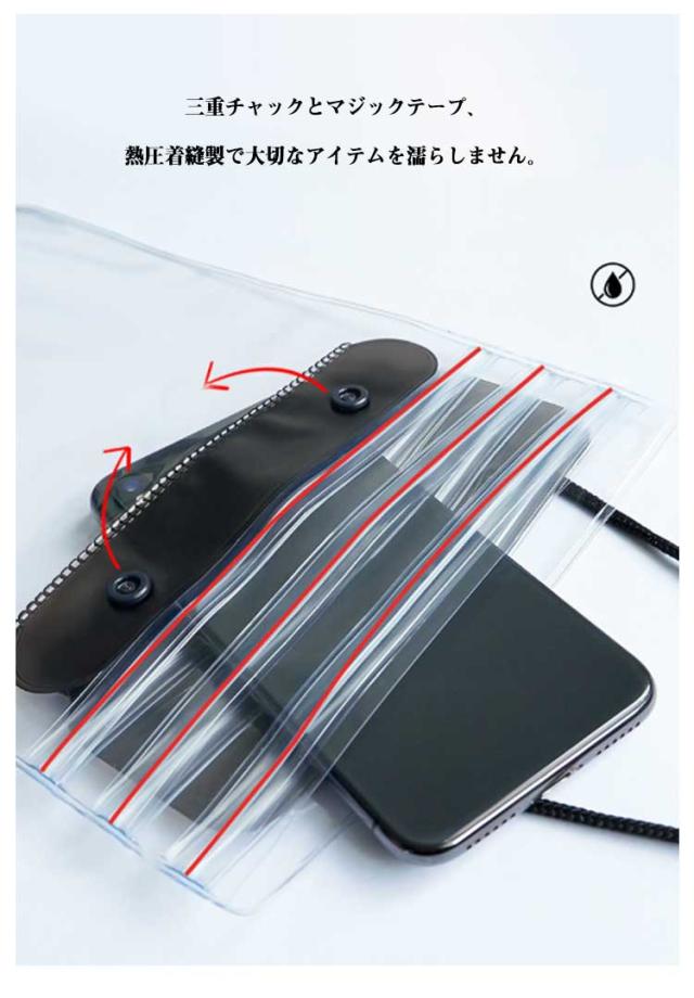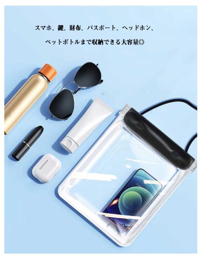 | 貴重品やよく使うものをまとめて持ち運べる便利な防水バッグ。 見た目以上にたっぷり入る収納力!スマホ・ミニ財布・充電器・キー・小物など入れます! 高品質PVC素材でクリアな質感とそのままスマホー操作ができます。 大容量サイズでビーチ、温泉、ウォーターパークなどで大活躍のアイテムです。 自分サイズに調節できるショルダーストラップ付きで、身軽に携帯。 水以外にも砂や雪などもしっかりガード、あなた次第で利用シーン広がる♪ 男女問わずお使いたいだけるシンプルなデザインと豊富なカラー! | |