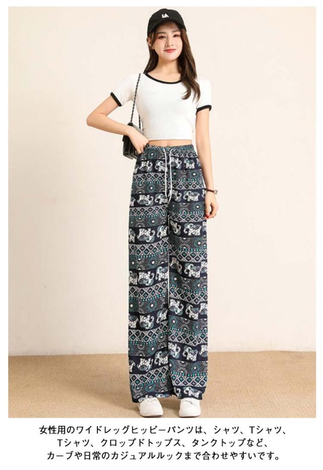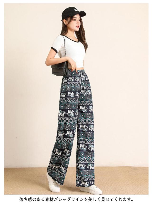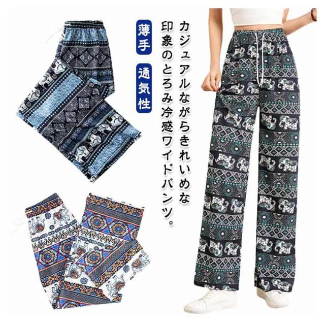 夏 薄手 ワイドパンツ 柄 とろみ ロングパンツ ルームウェア ゾウ 涼感 総柄 タイパンツ ワイド ロング パンツ 涼しい 冷感 レディース 部屋着 落ち感 薄手 通気性 体型カバー ハイウエスト ゴムウエスト ストレッチ パンツ おしゃれ