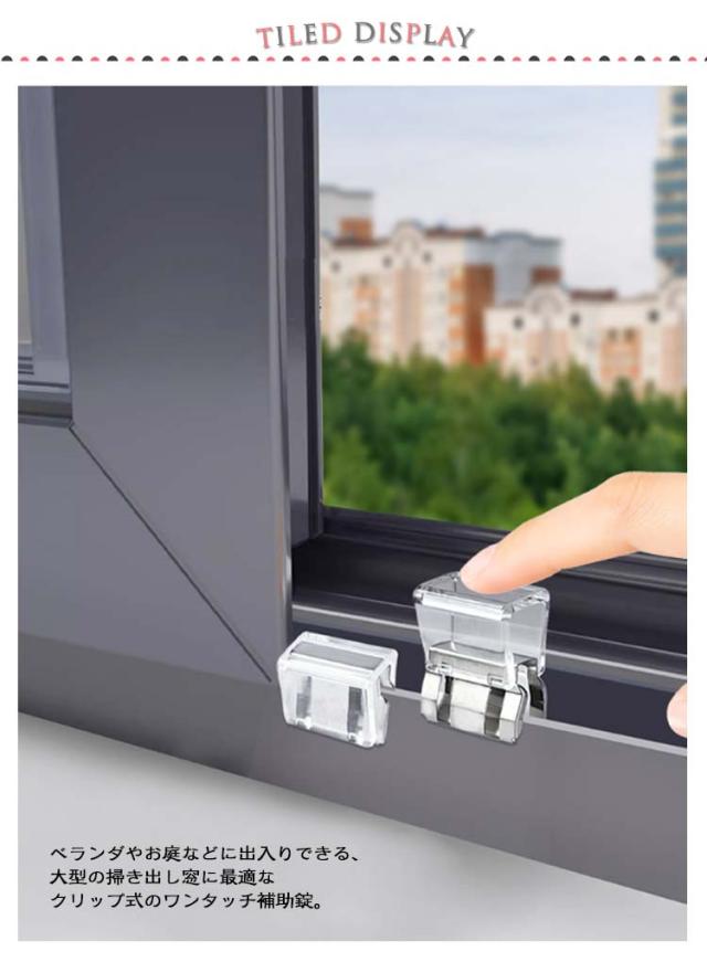 | お得な10個セット!サッシの溝に差し込んで、 押すだけで簡単に設置できる窓サッシ用補助錠セットです。 ベランダやお庭などに出入りできる、大型の掃き出し窓に最適なクリップ式のワンタッチ補助錠。 窓のサッシをしっかりロックして子供やペットを守る安心安全設計。 カギの開け閉めを覚えたばかりの小さなお子様のイタズラ対策や勝手に窓のカギを開けてしまう危険も防止。 取り付けは簡単で、換気しながらでもロックが可能です。 | |