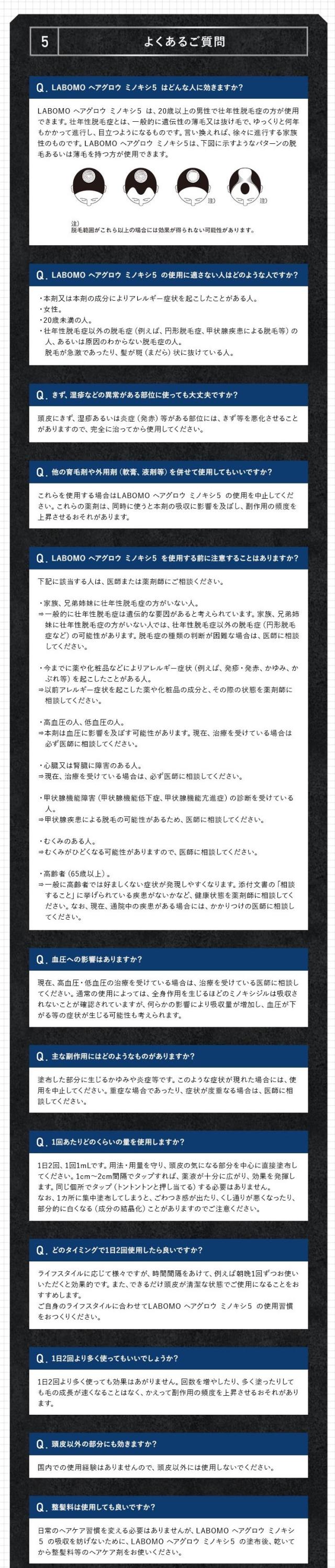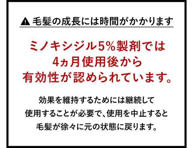 1. 毛髪が成長するには時間がかかります。効果がわかるようになるまで少なくとも4ヵ月間、毎日使用してください。[ ミノキシジルローション5%製剤の有効性は4ヵ月使用後から認められております。]