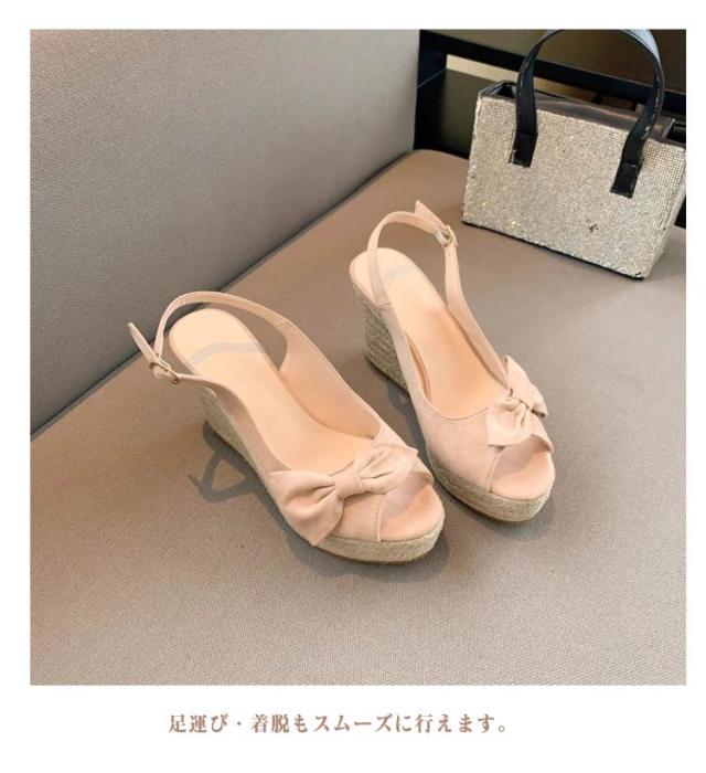 | カジュアルでシンプルな約7.0cmヒールのウェッジソールサンダル。 アッパーがリボン風になった「リボン」タイプ。 程よい7.0cmヒールで美脚見せ・安定感でラクチン&キレイを叶えます。 かかとのストラップが絶妙フィットで足あたりも良好です。 足運び・着脱もスムーズに行えます。 | |