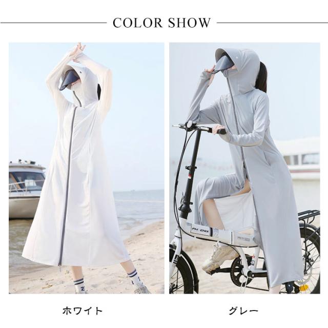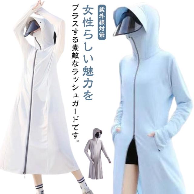 ラッシュガード UVカット 自転車 水着 レディース ロング丈 長袖 日焼け止め 接触冷感 ダブルジップ ラッシュガード 紫外線対策 全身カバー 指穴付 サンバイザー付き 冷房対策 体型カバー 軽量 吸汗速乾 ストレッチ性