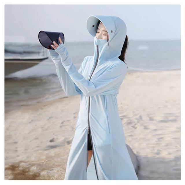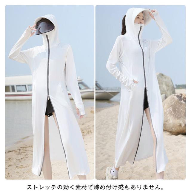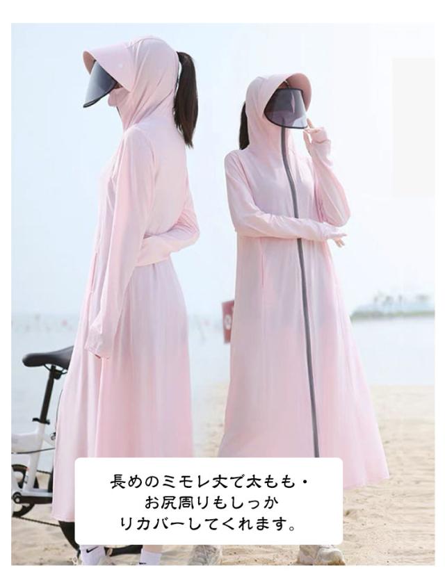 接触冷感 レディース ラッシュガード ロング丈 水着 ダブルジップ UVカット 日焼け止め パーカー 全身カバー 自転車 紫外線対策 長袖 指穴付 サンバイザー付き ラッシュガード 体型カバー 軽量 吸汗速乾 ストレッチ性