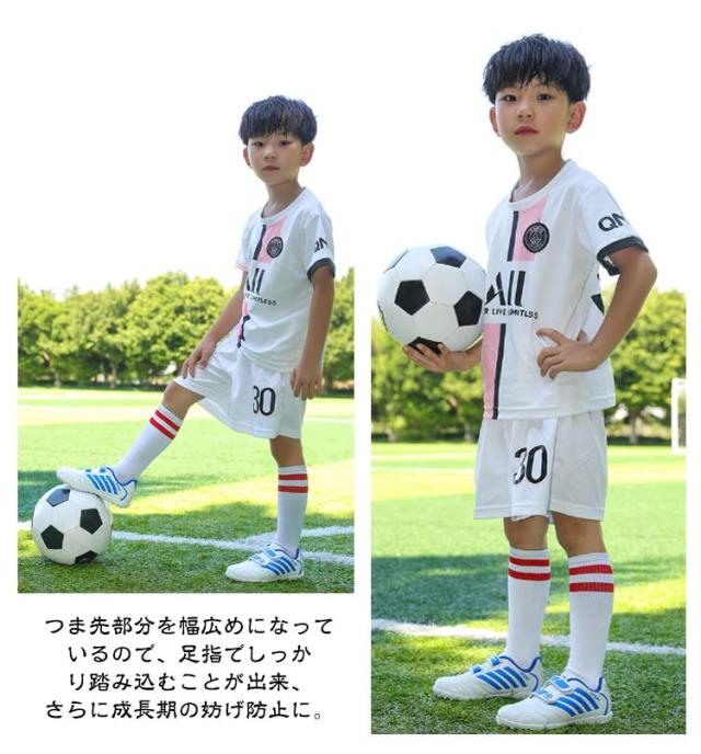| スポーティーなデザインが魅力のサッカーシューズが新登場です。 マジックテープの留め具のタイプ、子供に靴を履かせるほうが便利です。 アッパー部分は柔らかく、屈曲性もあるので、走りやすく、シュートもスマートに。 滑りにくいデザインの上に、着地時の衝撃を分散させて足の負担を軽減。 踵部分には保護設計を採用し、足をしっかりと保護します。 つま先部分を幅広めになっているので、足指でしっかり踏み込むことが出来、さらに成長期の妨げ防止に。 軽量素材を使用し、足への負担を軽減して、長時間のプレーでも疲れにくい。 | |