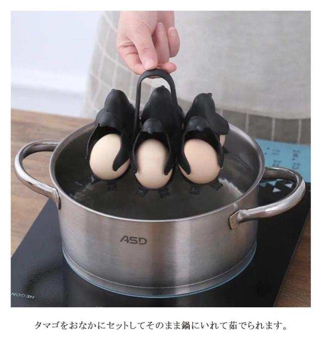 | 最大6つの卵を入れられるエッグホルダー タマゴをおなかにセットしてそのまま鍋にいれて茹でられます。 終わったらそのまま冷蔵庫で保管!もちろん生たまごケースとしても大活躍! このままテーブルまで運んじゃえば食事の時間が一気に華やかになります。 | |