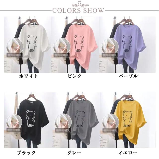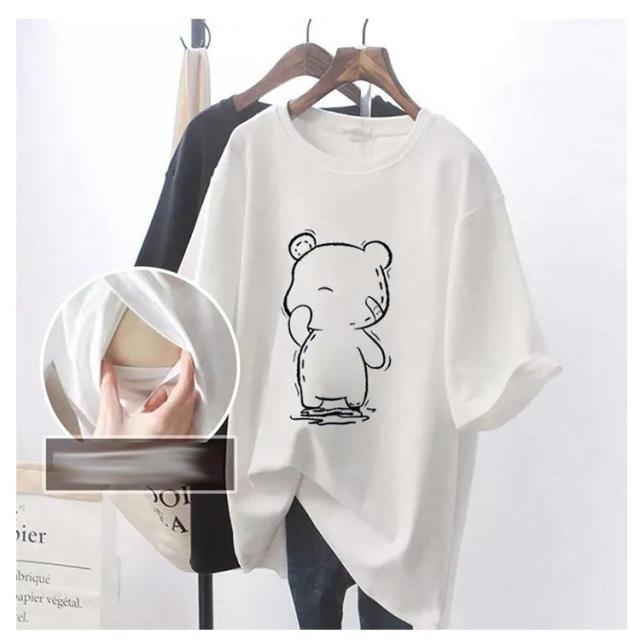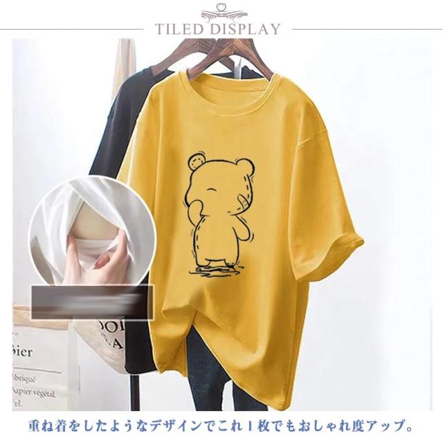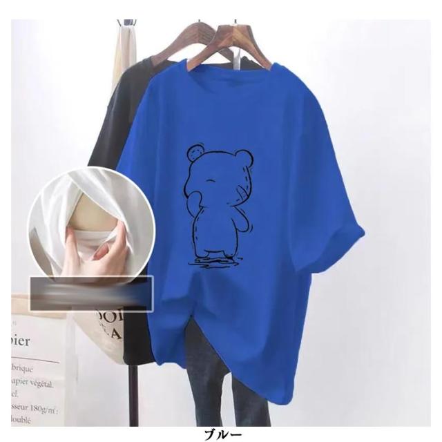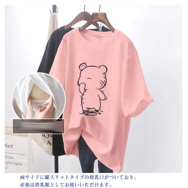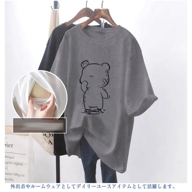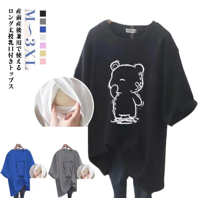 クルーネック トップス Tシャツ 授乳服 半袖 授乳Tシャツ 授乳口付き インナー ティーシャツ 便利 授乳しやすい ロゴTシャツ 安心 ロゴT マタニティ 授乳Tシャツ 丸首 授乳服 ロング丈 チュニック 出産準備 カットソー 体型カバー 妊婦服 大きいサイズ クマ